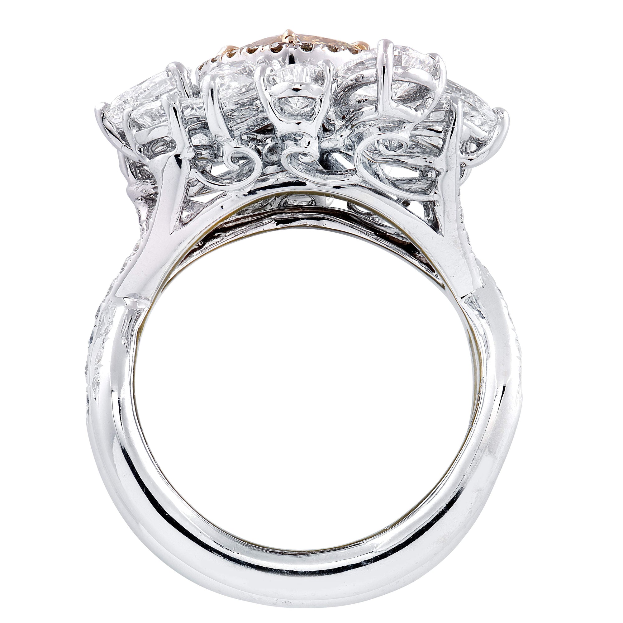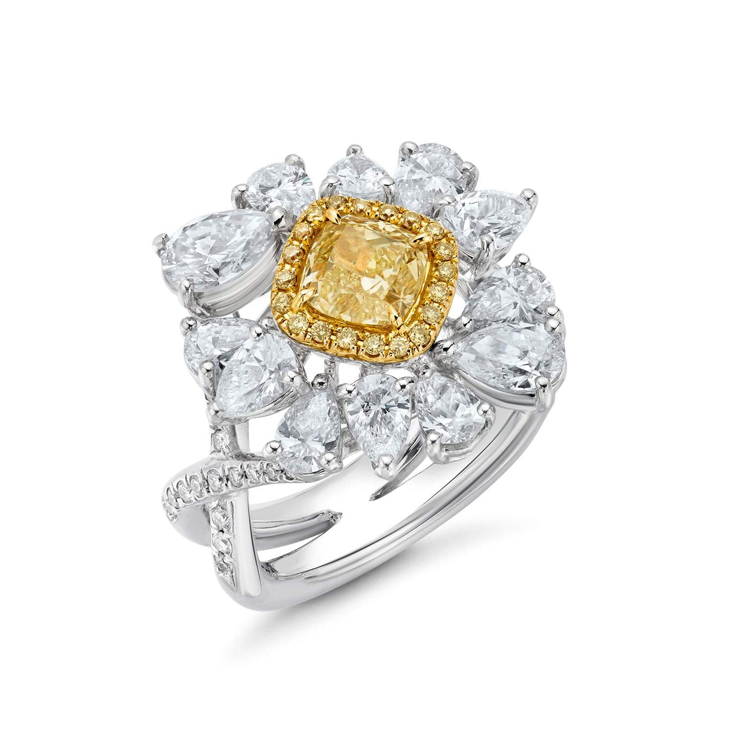 The House of Provident Jewelry is delighted to present an exquisitely crafted ring, elegantly designed in 18-carat white and yellow gold. At its heart lies a captivating GIA-certified 1.02-carat natural fancy greenish-yellow diamond, radiating elegance and rarity. Surrounding this remarkable centerpiece are 2.93 carats total weight of dazzling pear-shaped and round brilliant-cut diamonds, enhancing its brilliance. Currently a size 6, this stunning ring can be expertly resized to accommodate most sizes. With a total weight of 8.4 dwt, it is a true testament to refined craftsmanship and timeless beauty.