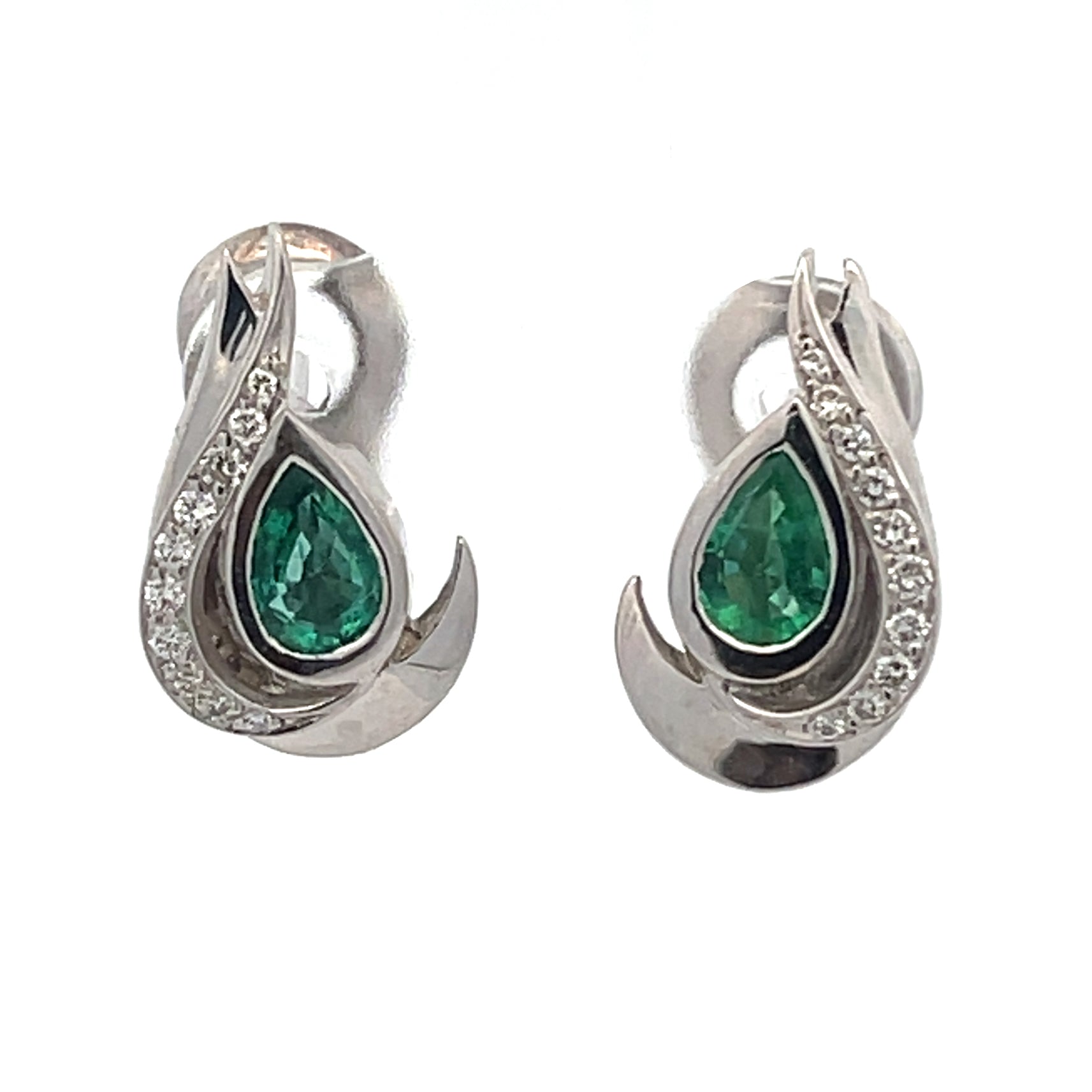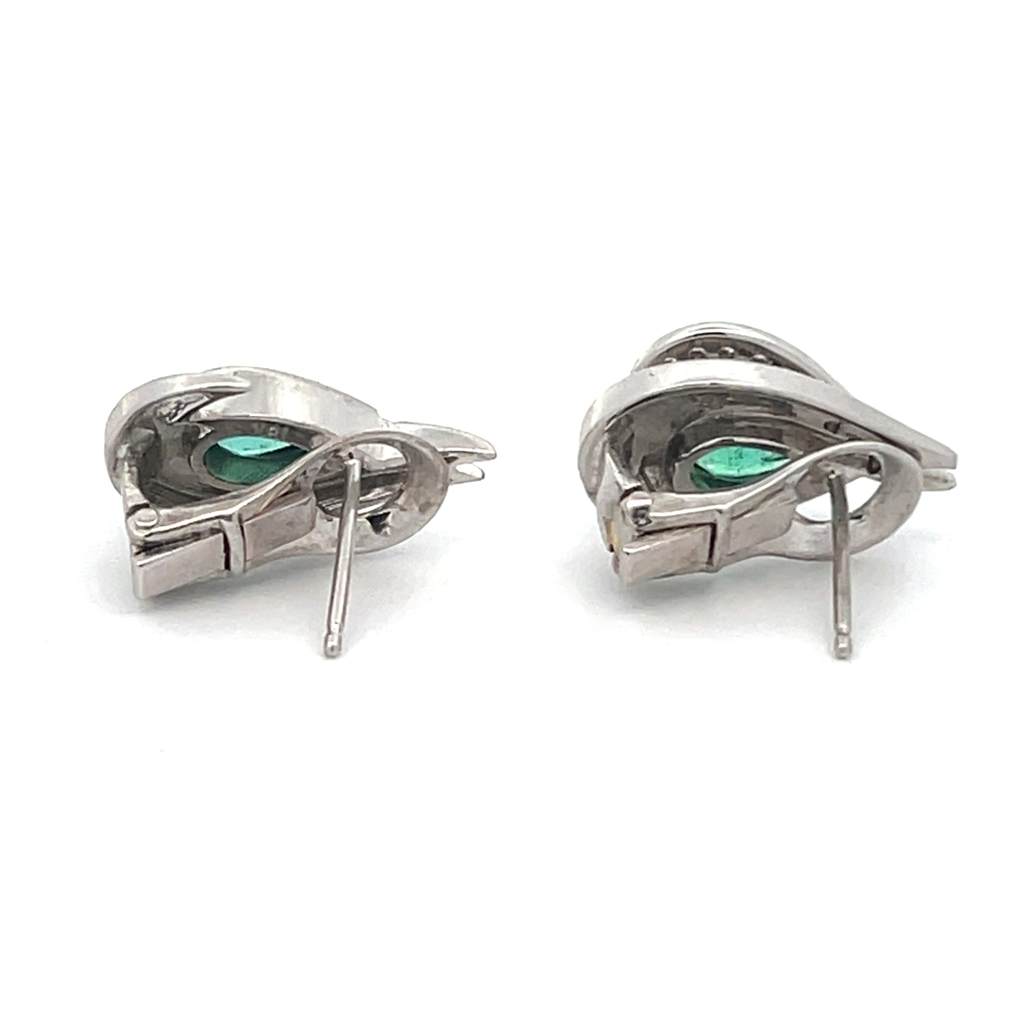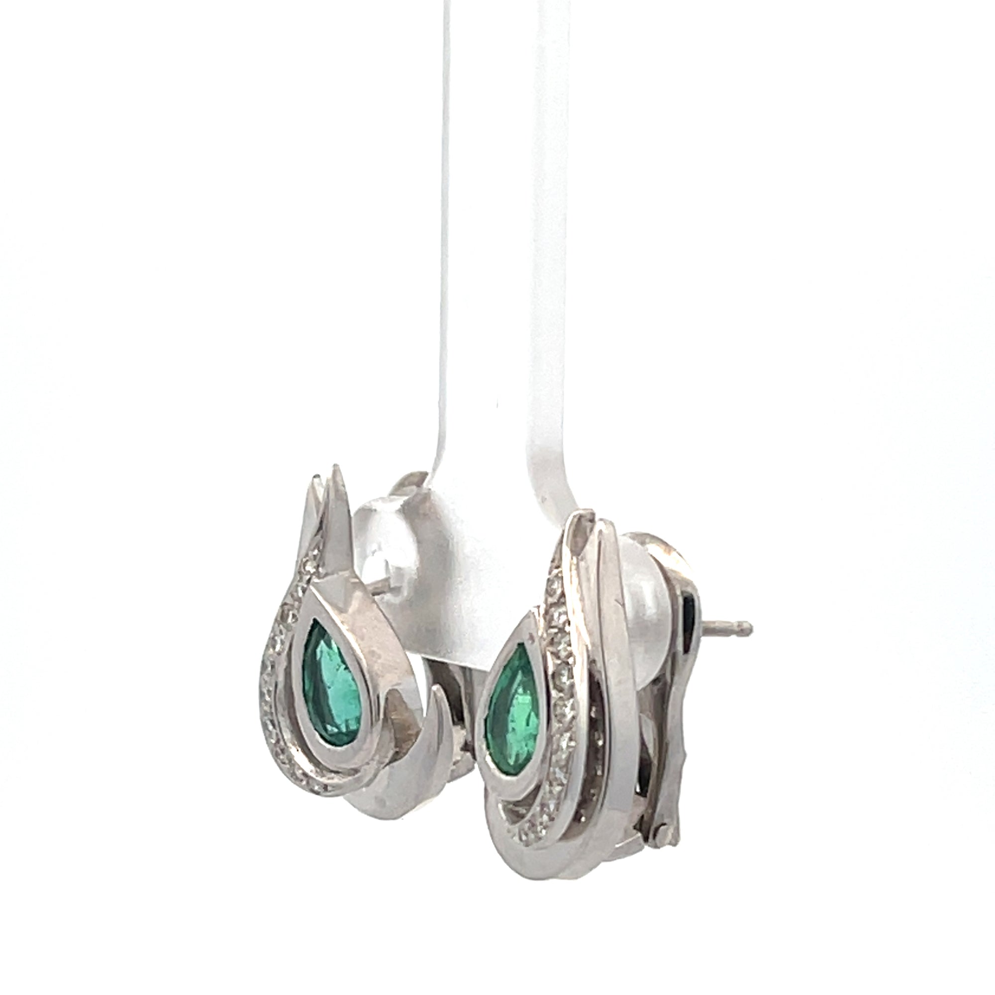 18 karat white gold Fiery Earrings containing 1.70 carat total of two pear-shape emeralds surrounded by 0.18 carat total of round diamonds with G-H in color and VS in clarity.