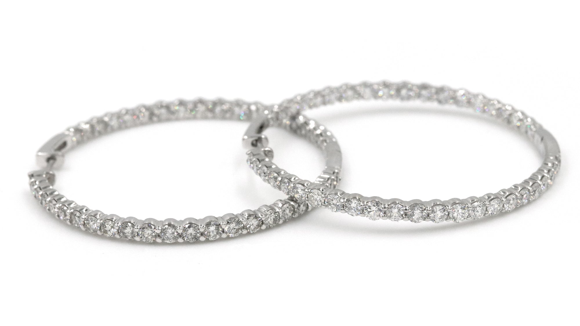 14K White Gold Diamond Inside Outside Hoops, 84Round Diamonds =~5.00Ctw, Slight Graduation In Front, Diamonds Ranging From ~.05-.08Cts Each.