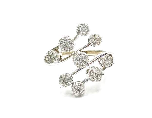 14K White Gold 9 Station Ring 63D= .75ctw, Center Round Diamonds Are Invisibly Set With 6 Round Diamonds Surrounding.