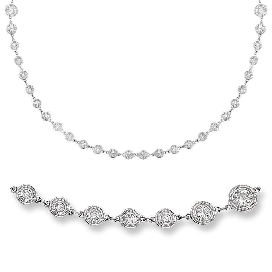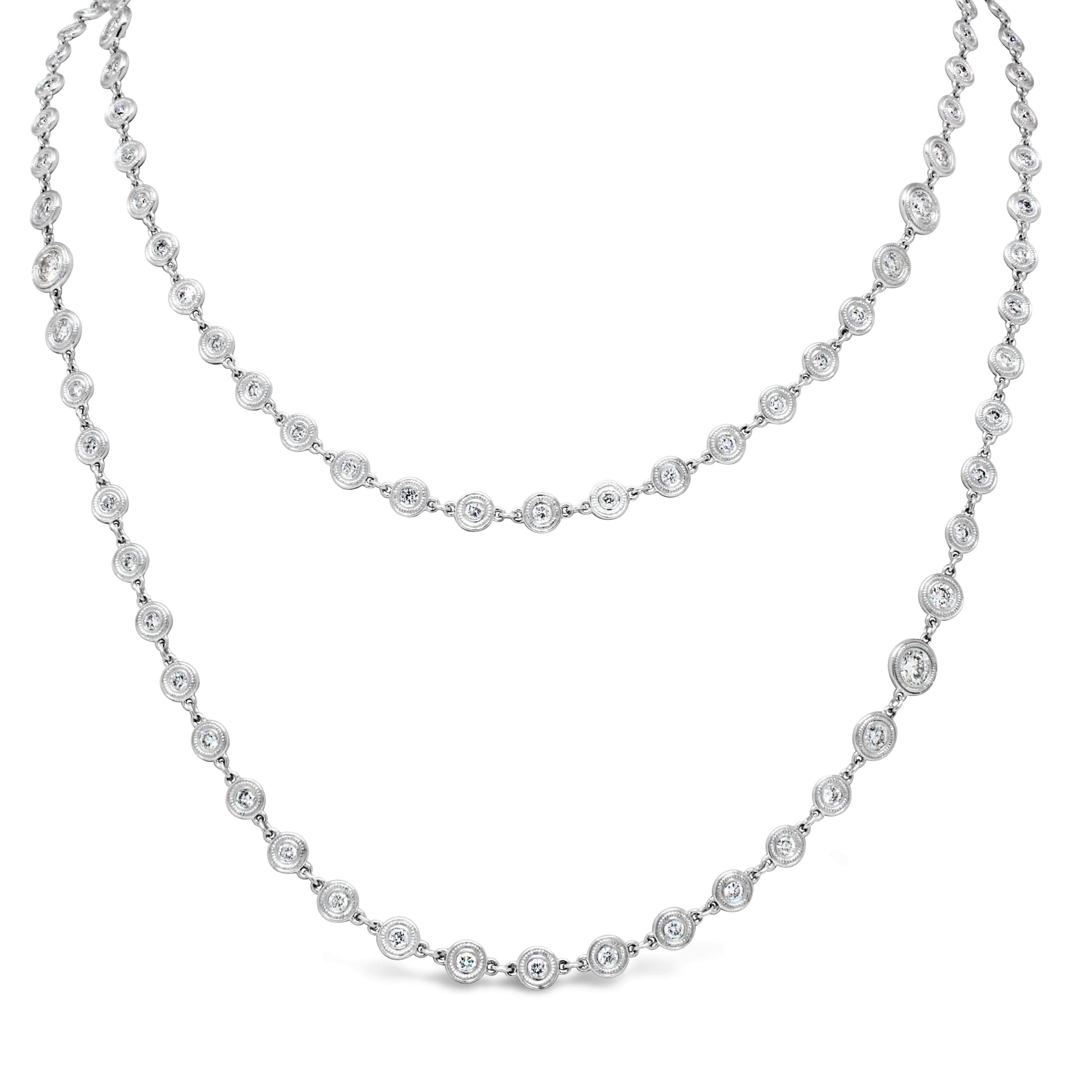 Crafted In 14kt White Gold, This Beautiful Necklace Features 8.75 Carats Of Gorgeous Bezel Set White Diamonds. The Bezels Also Feature A Design To Give This 40in Necklace That Extra Pizzazz.