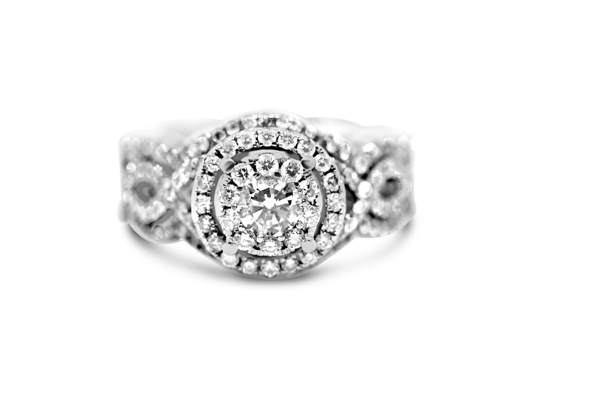 Bridal Set Featuring 1.50 Carats of Round Brilliant Cut Diamonds in 14K White Gold. The wedding bands have been soldered together on each side of engagement ring.