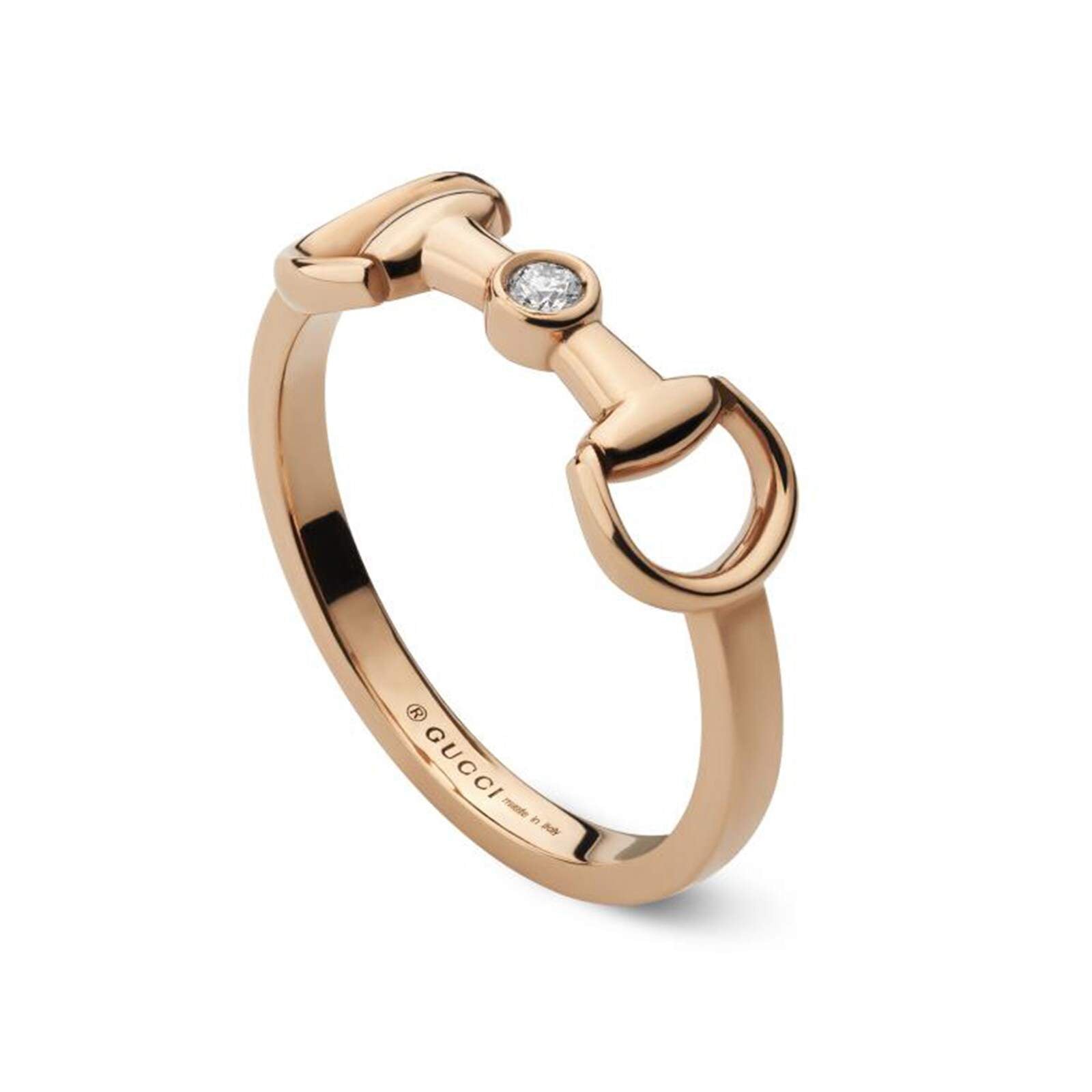 18kt Rose Gold Gucci Horsebit Ring Containing .03ct Of Round Brilliant Cut Diamonds. The Ring Is 2mm Wide At The Bottom And Is A Size 6.5, It Can Be Ordered In Most Sizes.