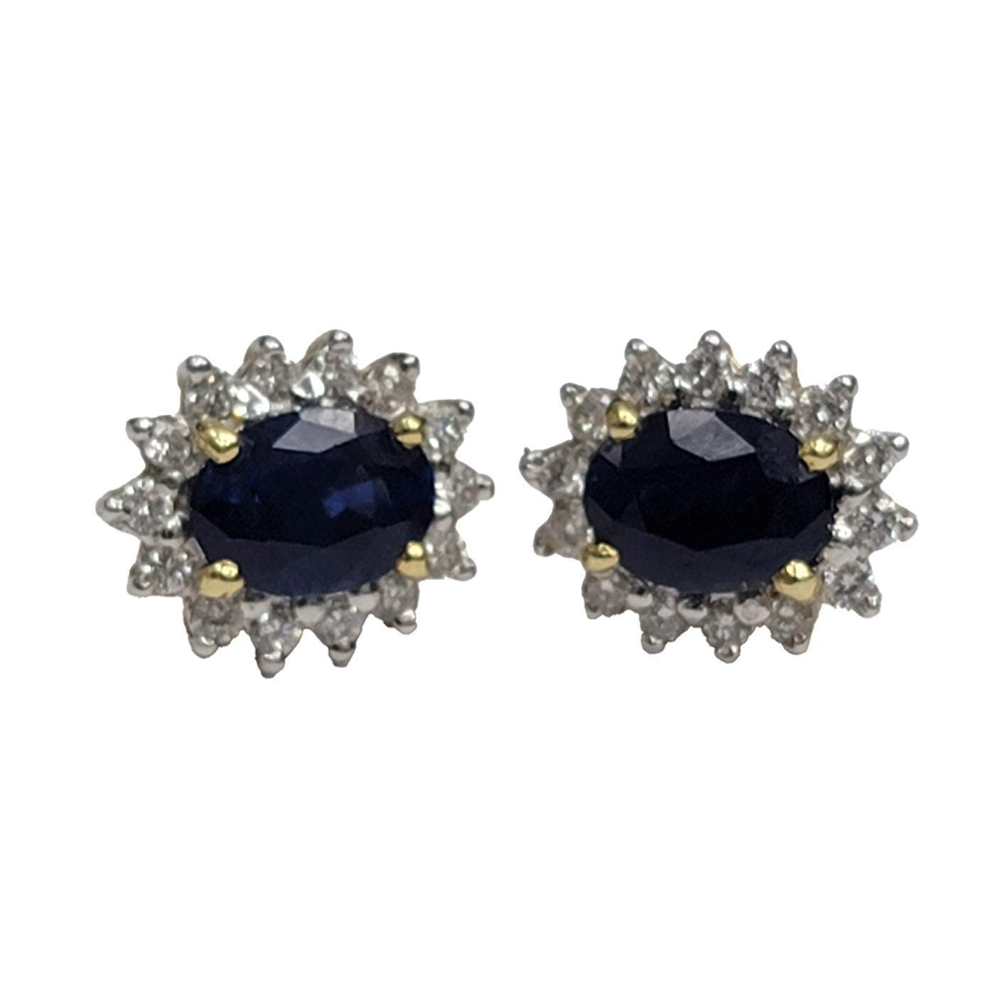 18K Yellow Gold Oval Blue Sapphire And Halo Diamond Earrings 2S=1.00Ctw 16D=~.25Ctw