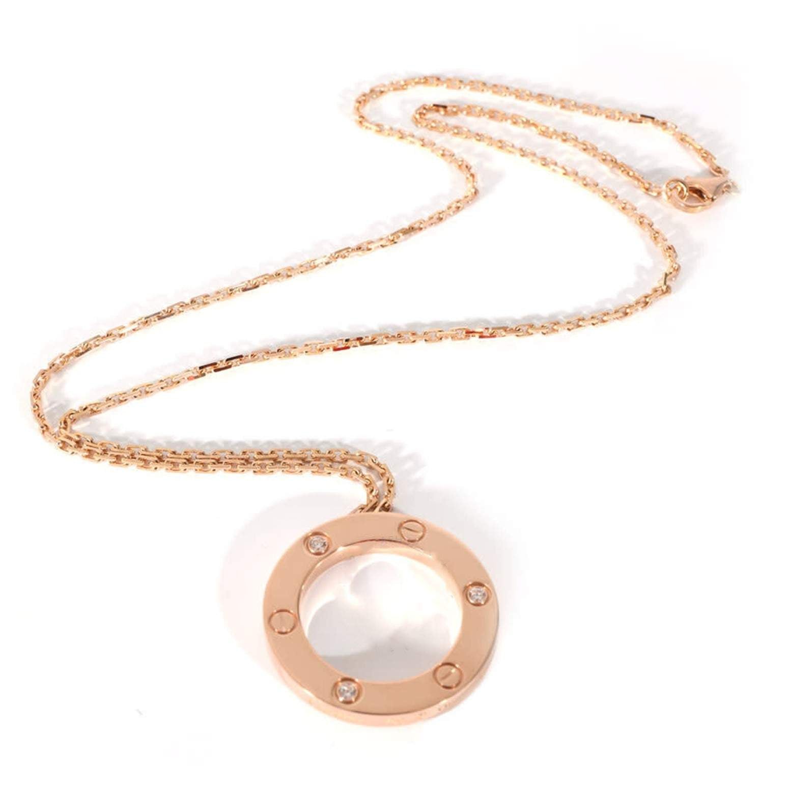 18kt Rose Gold Cartier Love Necklace Containing .07 Carats Of Round Brilliant Diamonds Bezel Set. The Pendant Measures Approximately 23mm And Is On An 18 Inch Chain. The Necklace Comes With Original Box.