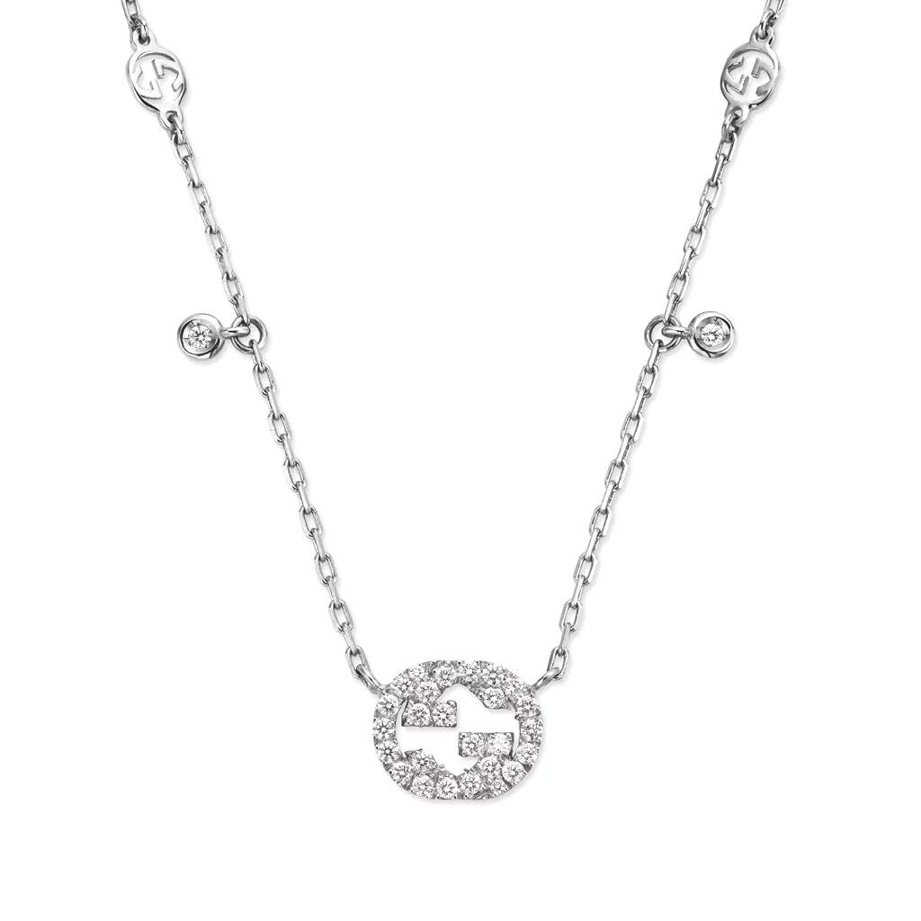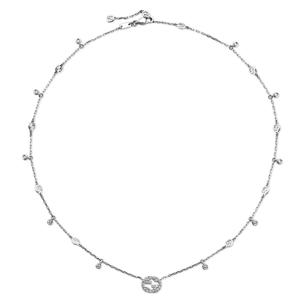 18kt White Gold Gucci Diamond Station Necklace Containing Approximately .25 Carats Of Round Brilliant Cut Diamonds. The Necklace Is 16.5in In Length And The Interlocking "G" Measure Approximately 11mm.