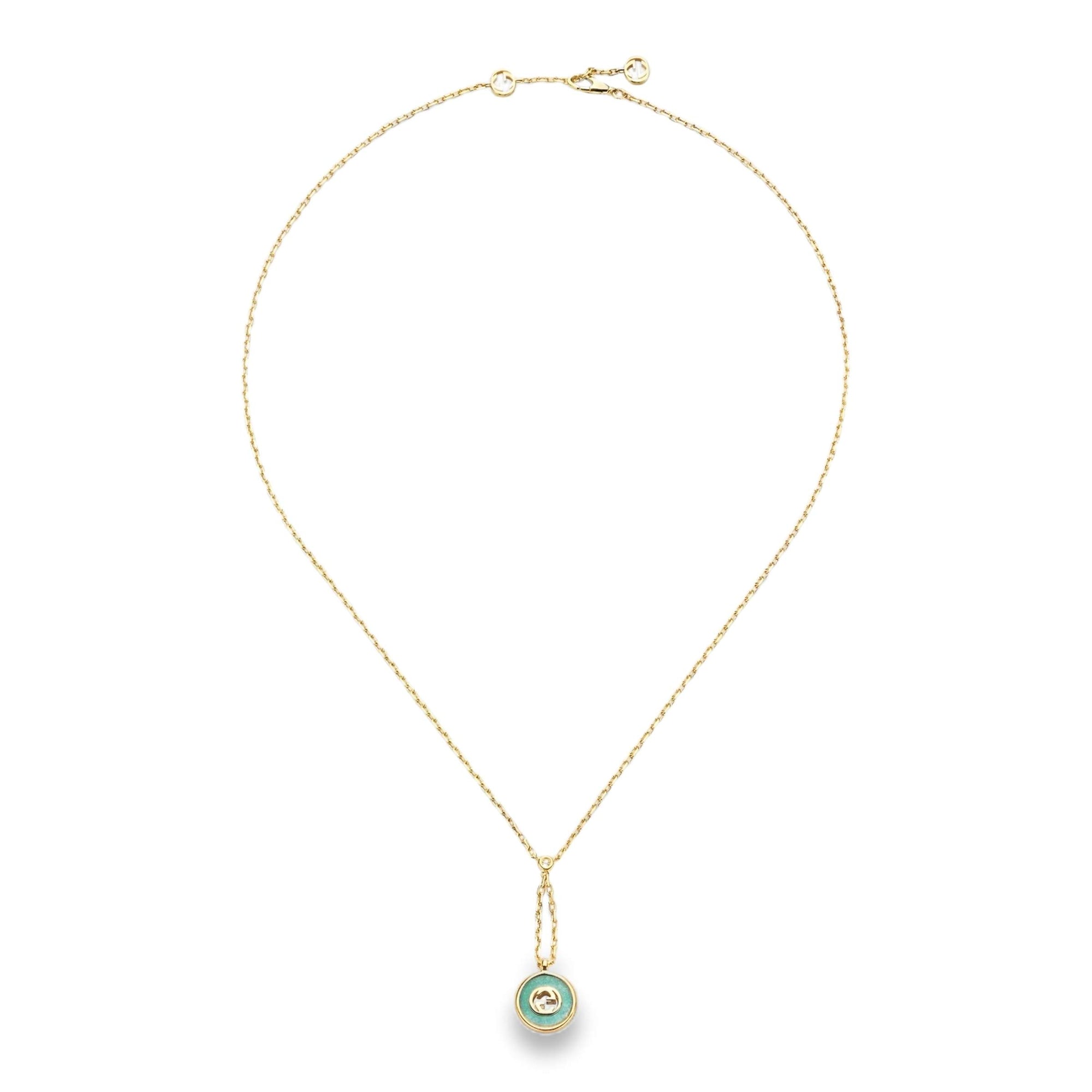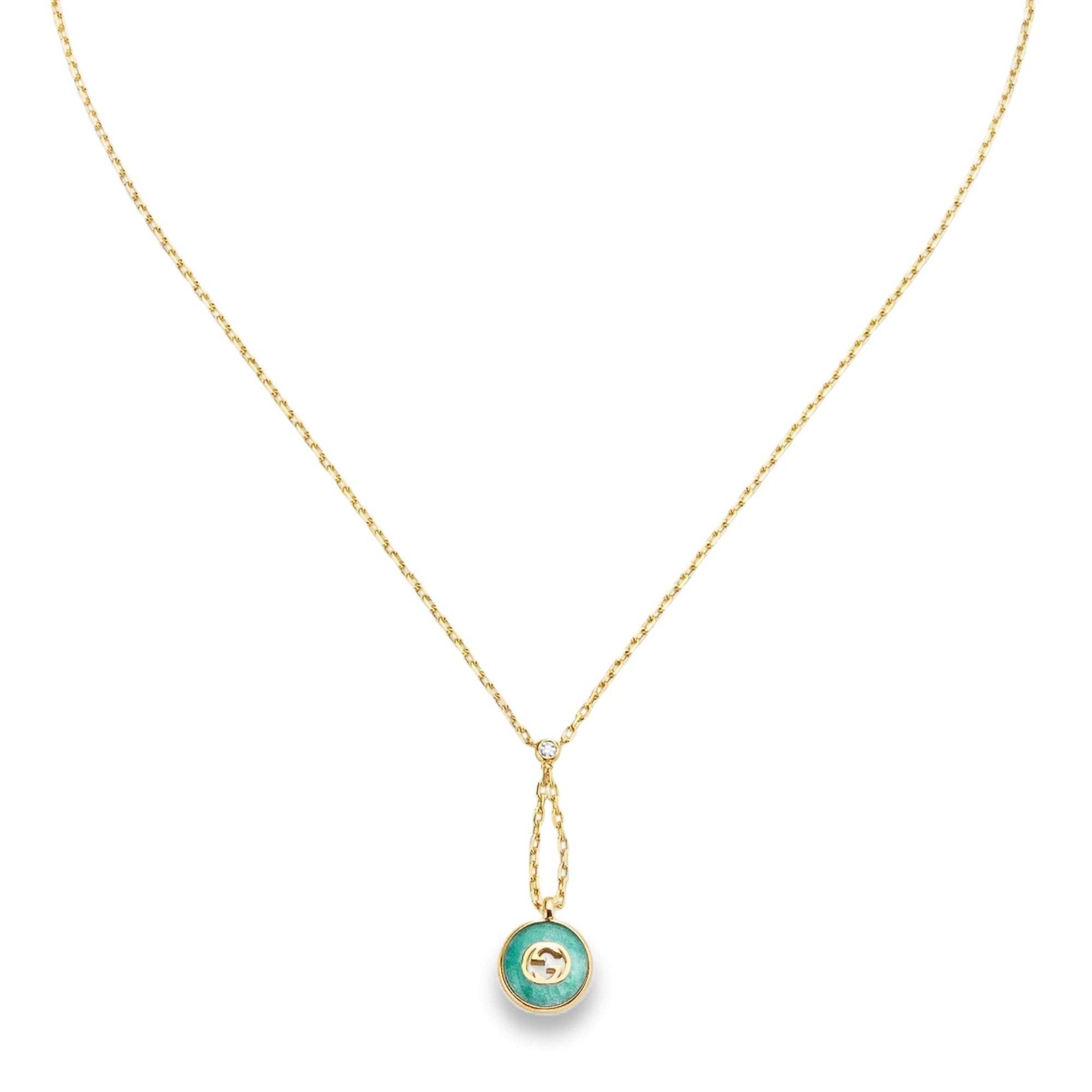 18kt Yellow Gold Gucci Interlocking Necklace Containing Amazonite Approximately 2.25ct And .02 Carats Of Round Brilliant Diamonds. The Length Of The Necklace Is 17.7 Inches In Length That Is Adjustable To 16 Inches With The Drop Being Approximately 1 Inch. The Gucci Motif Is Approximately 12mm.