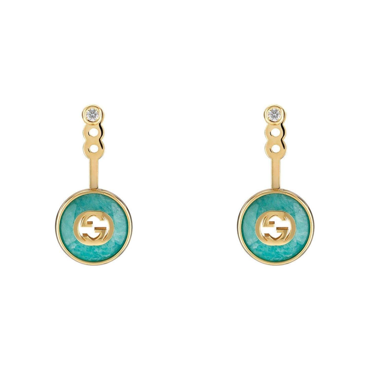 18kt Yellow Gold Gucci Interlocking Earrings And Jackets Containing .05 Carats Of Diamonds And Amazonite Bezel Set. The Earrings Measure 12mm And Are Approximately 1 Inch In Length.