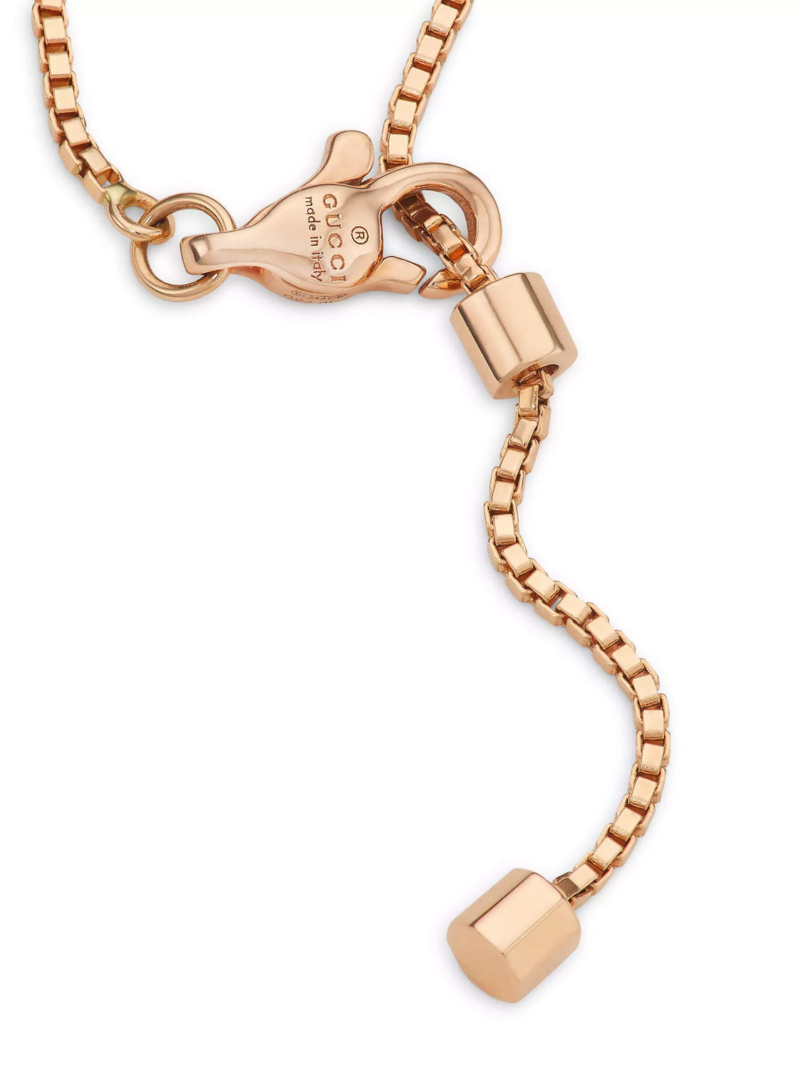 18kt Rose Gold Gucci Link To Love Bracelet Approximately 7in In Length With A Bar Pendant Engraved Gucci.