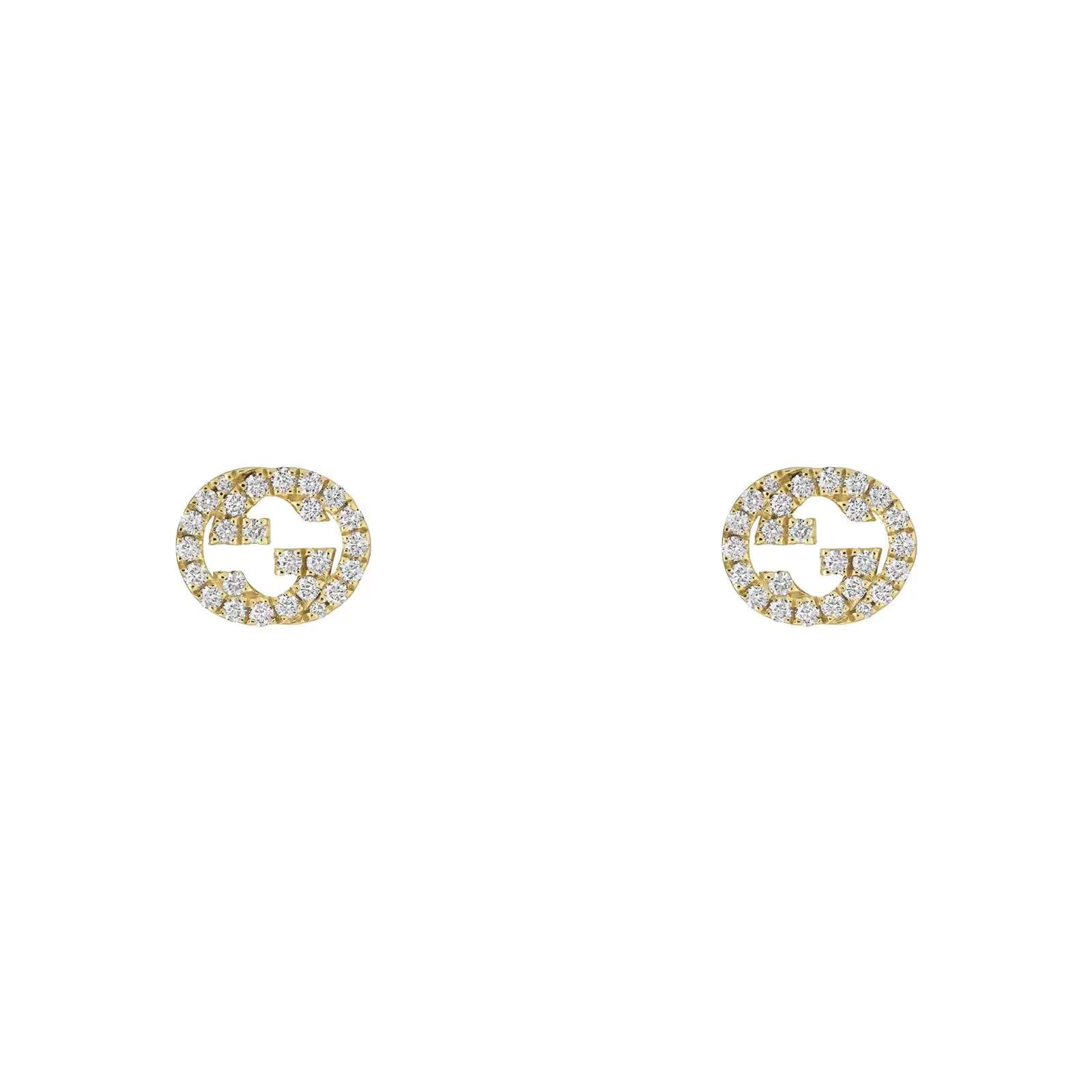 18kt Yellow Gold Large Gucci Interlocking "G" Earrings Containing .34 Carats Of Round Brilliant Cut Diamonds. The Earrings Measure .38mm X .31mm And Include Butterfly Backs.