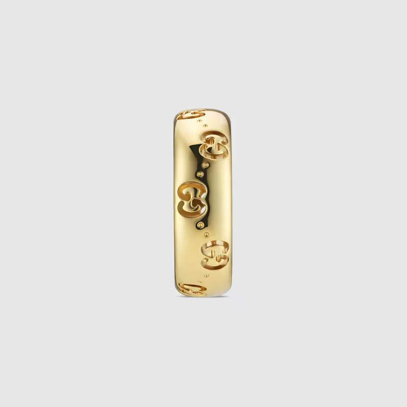 18kt Yellow Gold Icon Ring By Gucci With GG Cut-outs 6mm Wide And Is A Size 6. This Ring Can Be Ordered In Your Size.