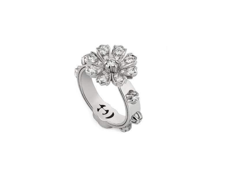 18KT WG GUCCI FLORA RING, GG LOGO AT BOTTOM DIA=.63CTS