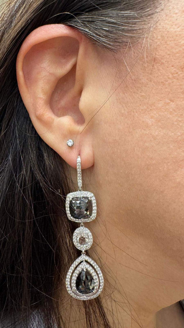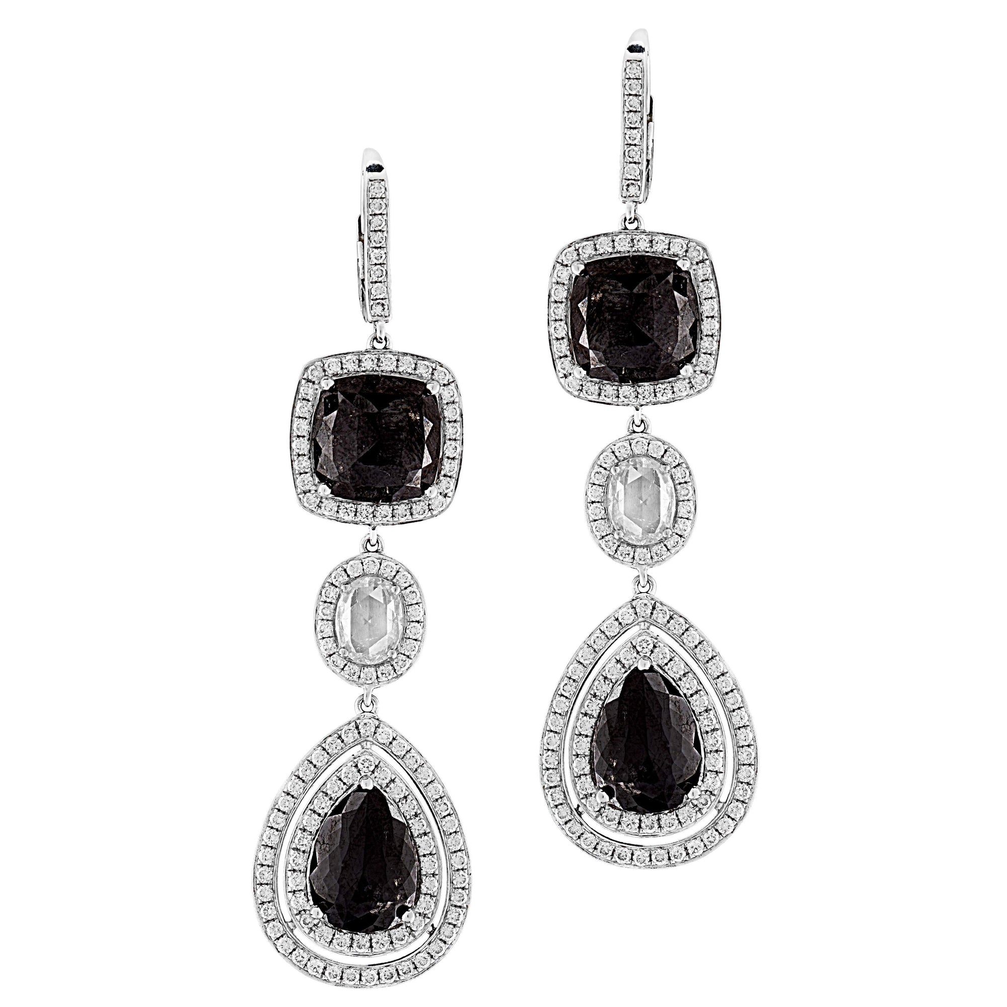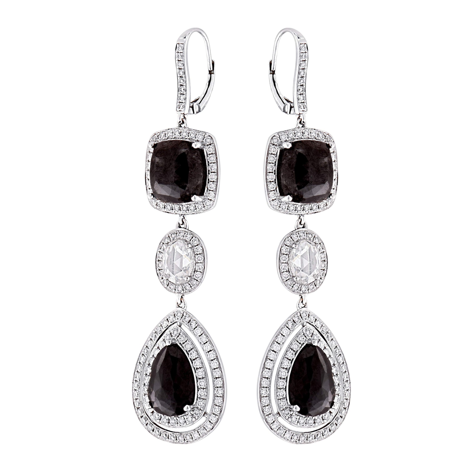 From the House of Provident Jewelry, these exquisite earrings are delicately crafted in 18-karat white gold. Designed with articulated movement, they gracefully dangle, making them the perfect choice for an elegant evening. The earrings feature four captivating rose-cut black diamonds, totaling approximately 18.24 carats. Complementing these are two GIA-certified oval rose-cut diamonds, weighing a combined 2.02 carats, with an I color grade and SI2 clarity. Encircling the rose-cut diamonds are approximately 2.8 carats of round brilliant-cut diamonds, G-H color and VS-SI clarity. Measuring 2.5 inches in length and 19mm at their widest point, these stunning earrings have a total weight of 10.6 dwt.