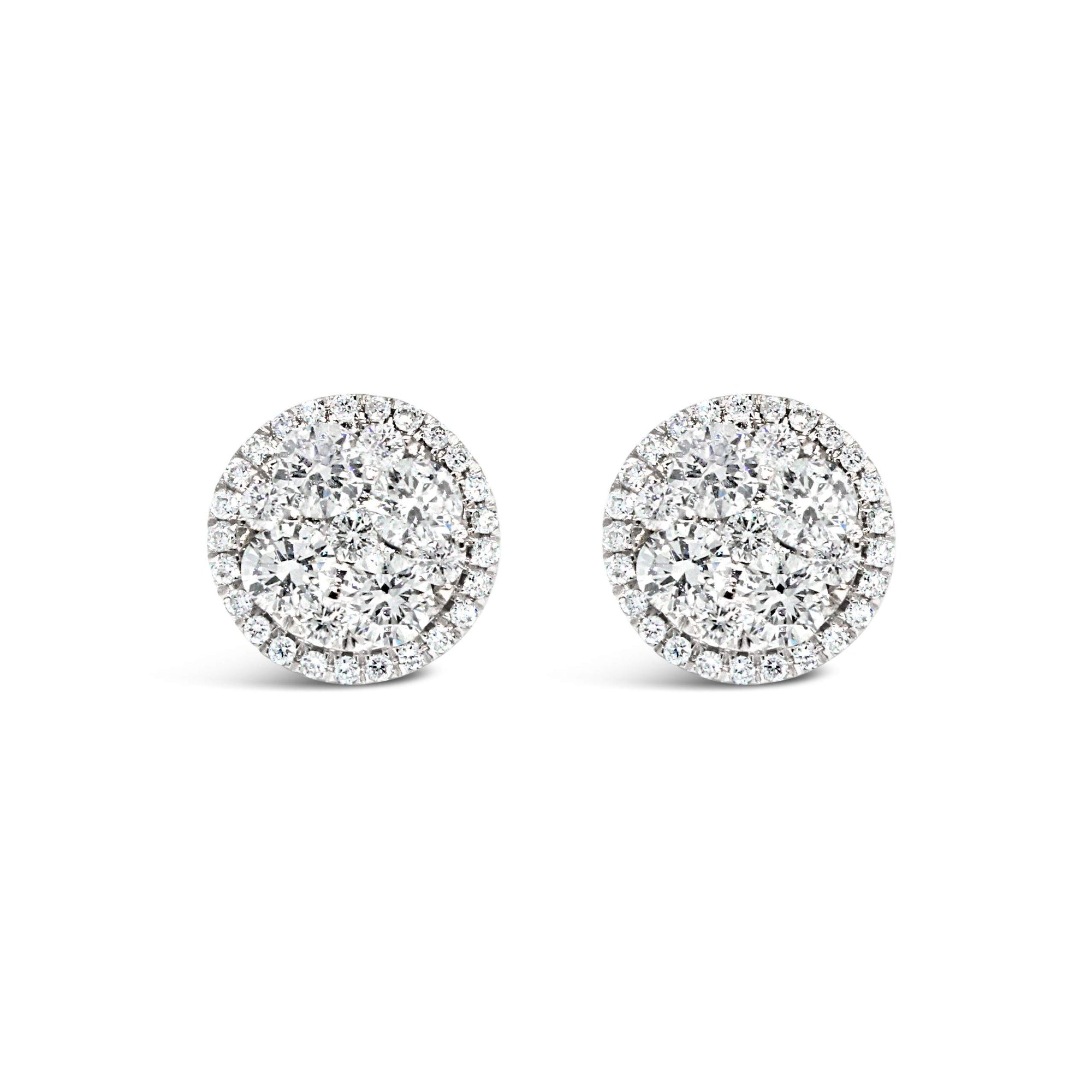 Stunning 18K White Gold Diamond Cluster Stud Earrings Featuring 2.10 Carats of Round Brilliant Cut Diamonds