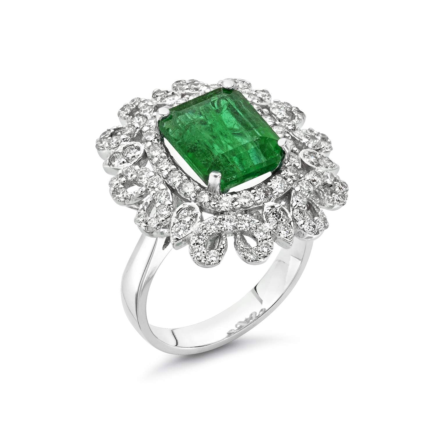 Beautiful 18K White Gold Ring With a 4.14 Carat Emerald Surrounded By 1.34 Carats of Diamonds, The Ring Can Be Sizes to Accommodate Most Sizes.