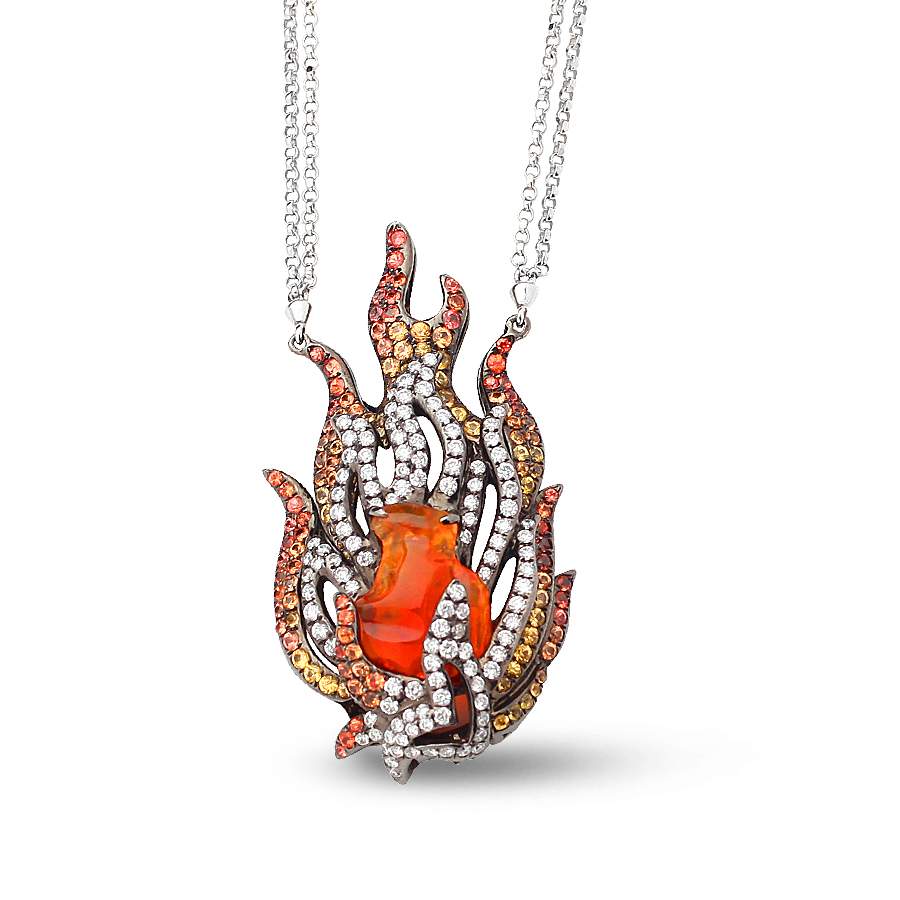 Beautiful 18K White Gold Fire Opal Pendant Accented With 1.50 Carats of Diamonds and 2.35 Carats of Sapphires.