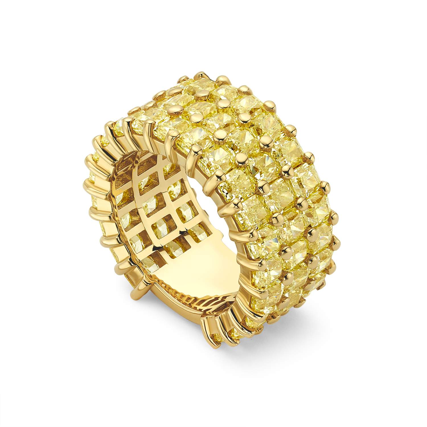 Beautiful 18K Yellow Gold Three Row Eternity Band Featuring 13.01 Carats Of Fancy Yellow Radiant Cut Diamonds, This Ring Can Be Sized To Most Sizes.
