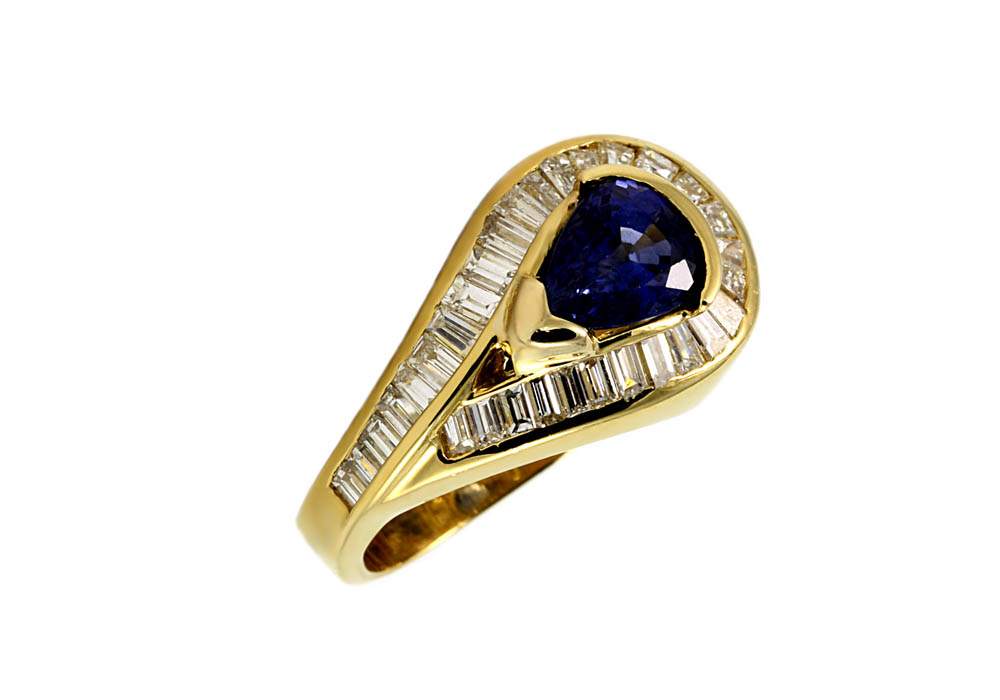 Beautiful 18K Yellow Gold Charles Krypell Ring with a 2.00 Carat Blue Sapphire Accented by 2.00 Carats of Baguette Cut Diamonds. This Ring Can Be Sized To Most Sizes.