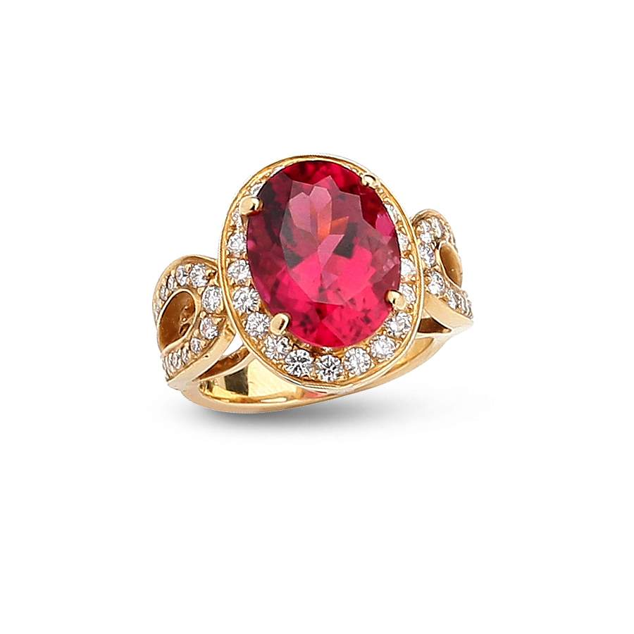 Stunning 18K Yellow Gold Ring with a 7.00 Carat Oval Cut Pink Tourmaline Accented by 1.00 Carats of Round Cut Diamonds.