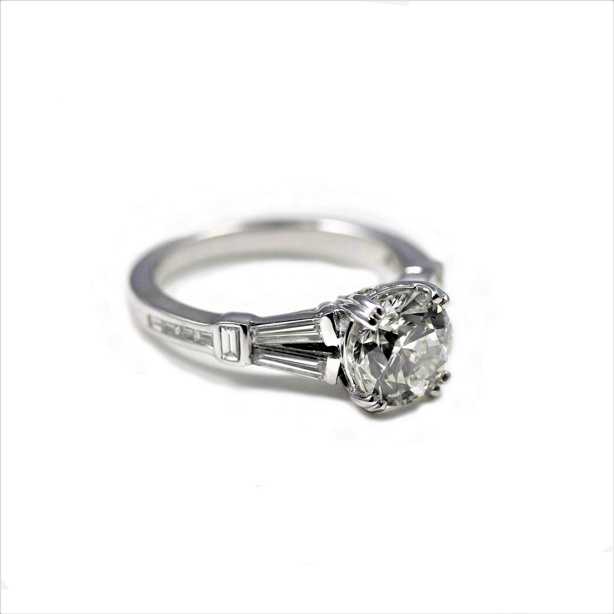 Ring features a 2.00 carat round center diamond, F color, SI2 and 14 diamonds with a total weight of .58 carats, set in 18K white gold.