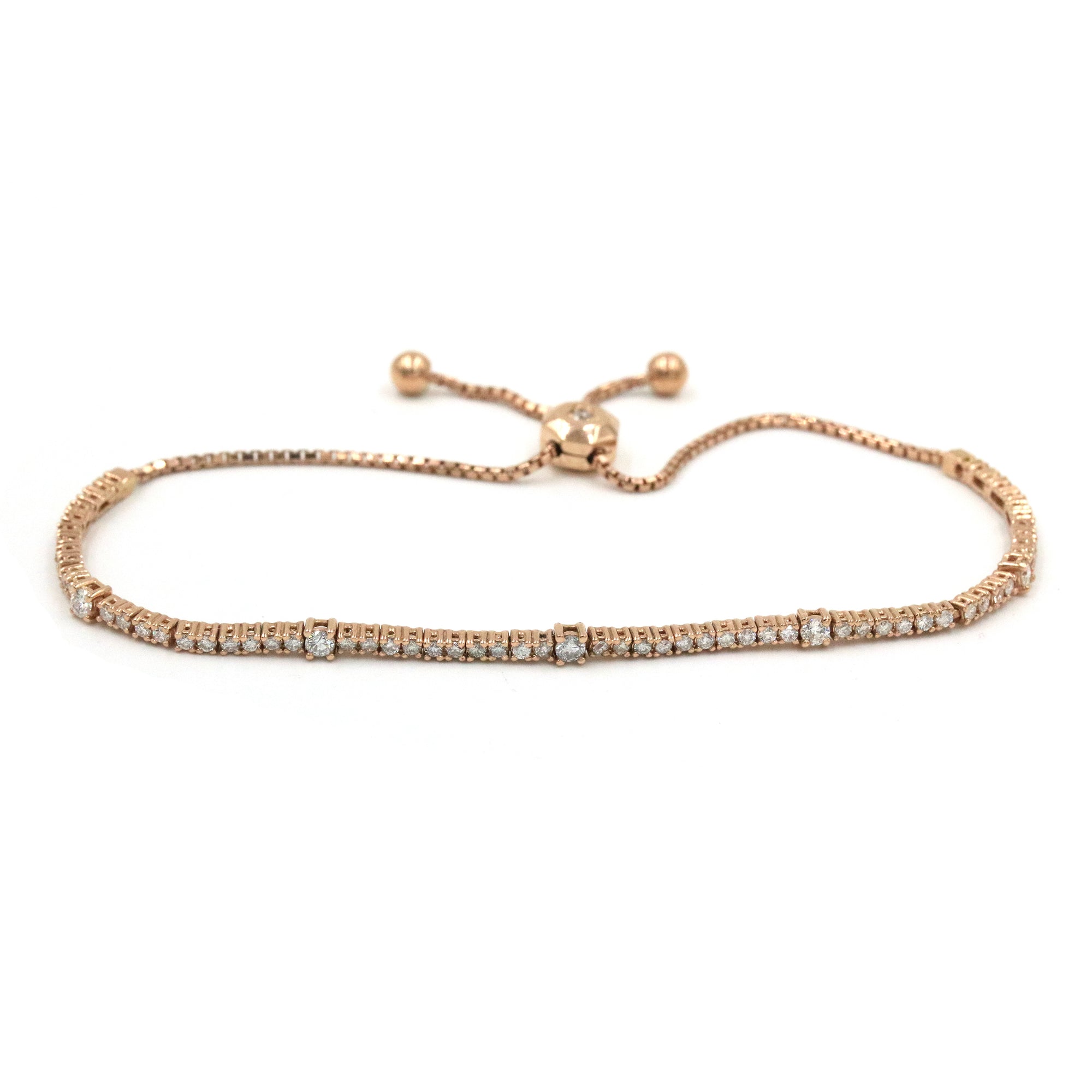 14 karat rose gold adjustable bracelet containing 1.33 carats of round diamonds with F in color and SI in clarity.