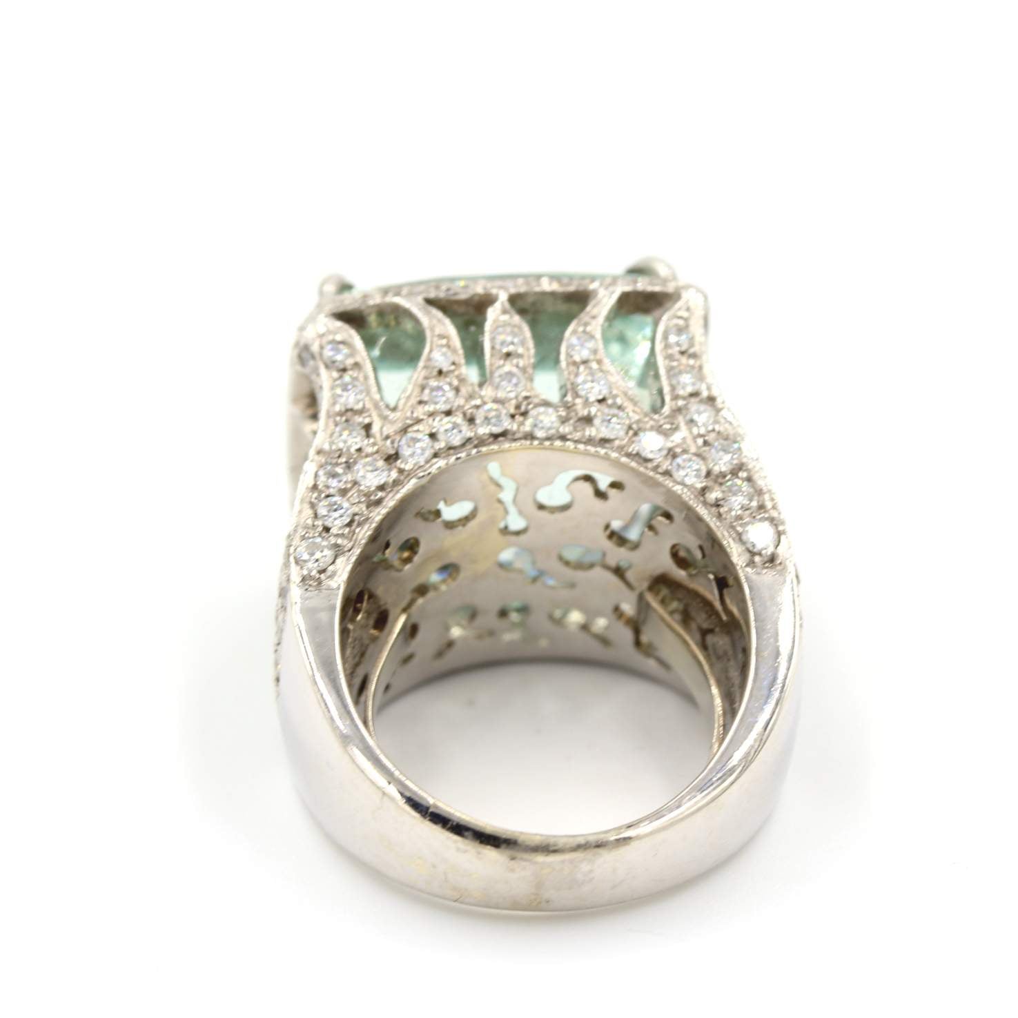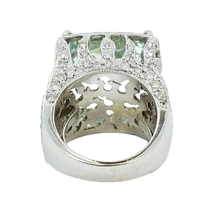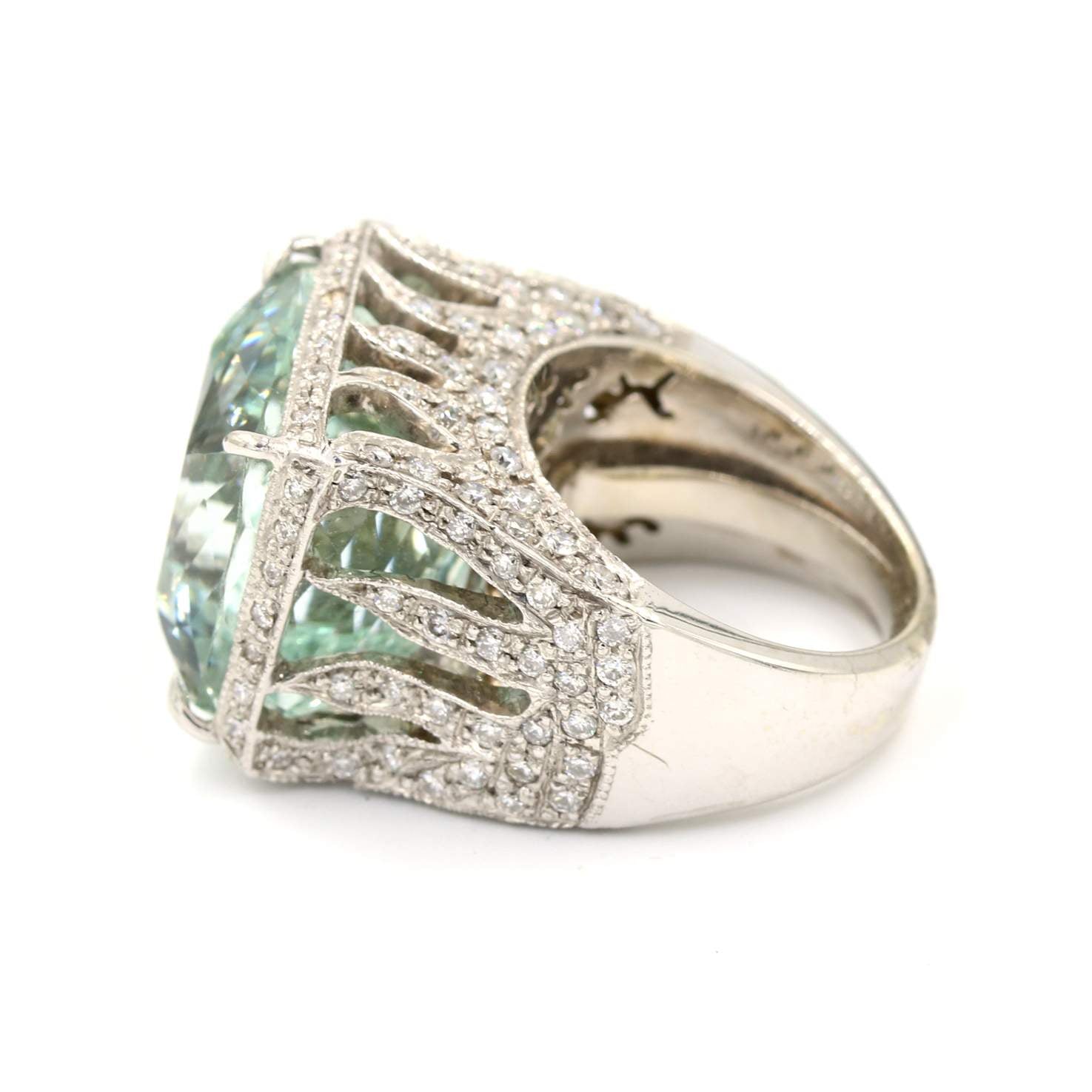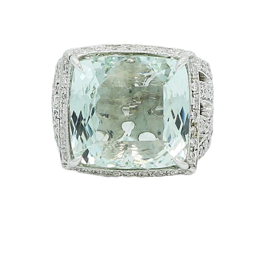 18 karat white gold custom made ring containing 24.59 carats of a center aquamarine surrounded by 1.55 carats of diamonds.