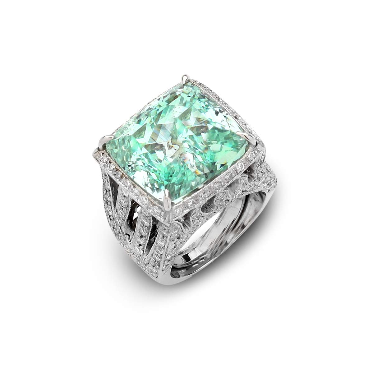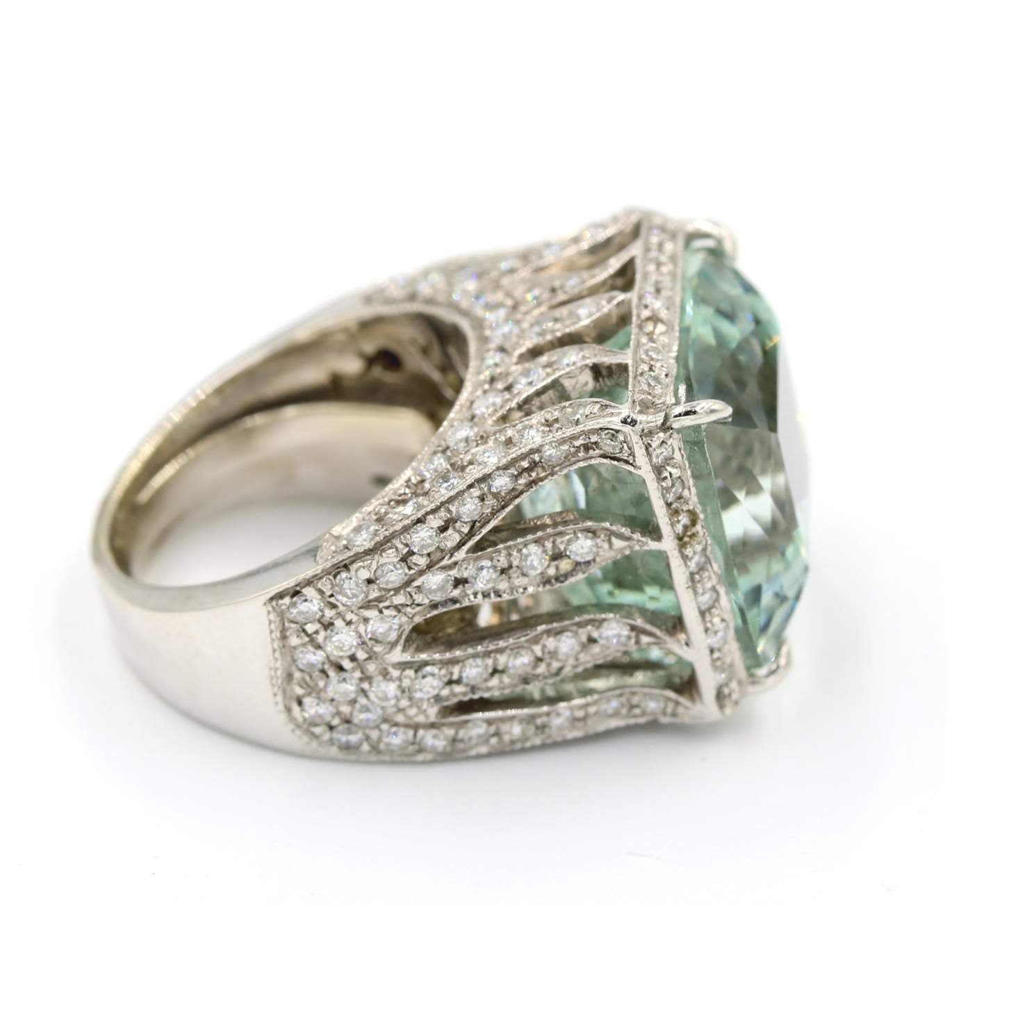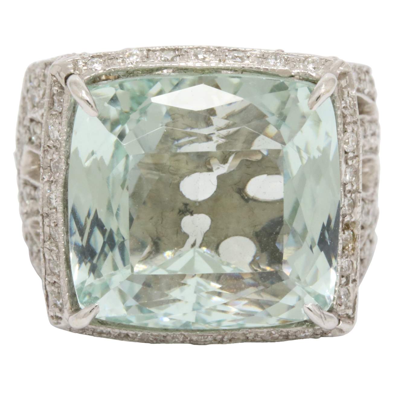 18 karat white gold custom made ring containing 24.59 carats of a center aquamarine surrounded by 1.55 carats of diamonds.