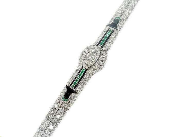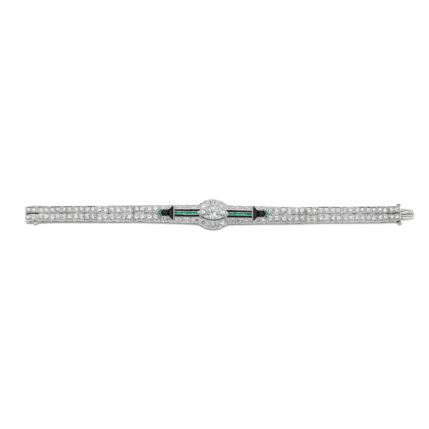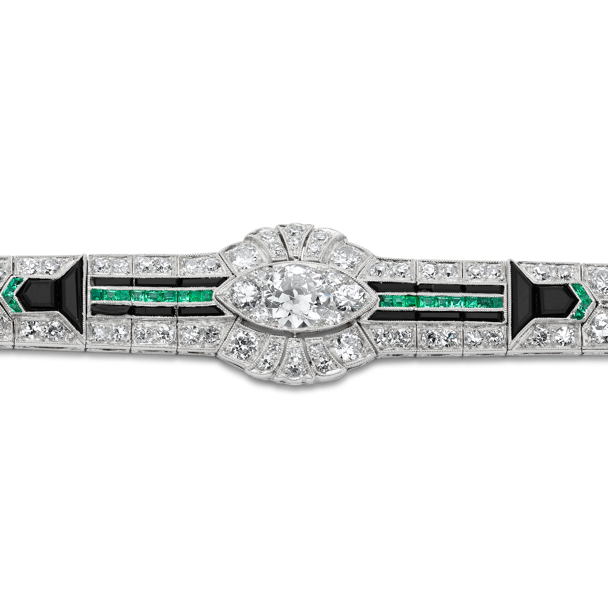Platinum Art Deco Bracelet containing 0.92 carats of a center diamond surrounded by 142 diamonds, black onyx, and emeralds.
