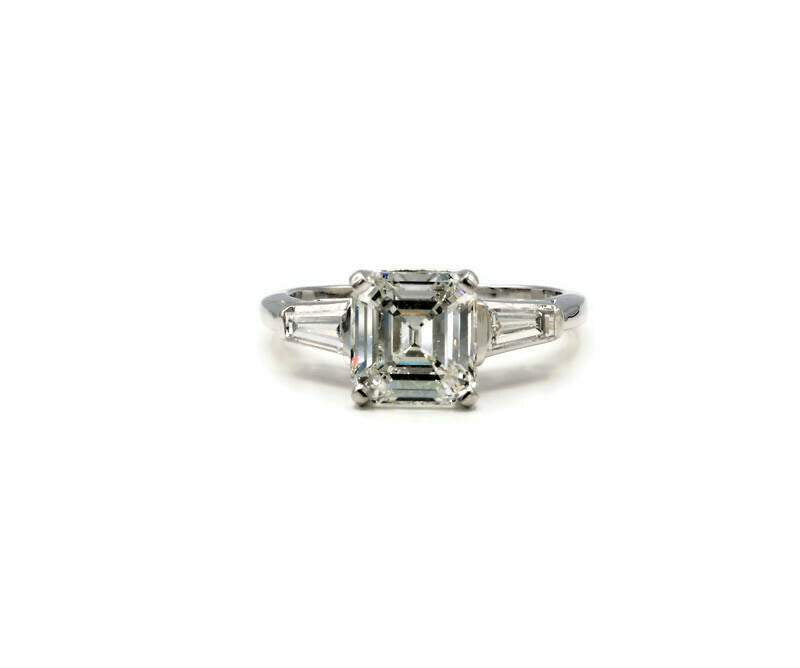 Ring features a 2.02 carat, GIA certified Asscher cut center diamond, H color, VVS2 clarity, set in a platinum setting with 2 tapered baguettes with a total weight of .30 carats.