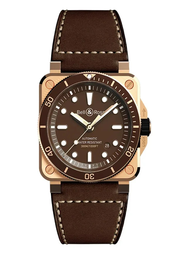 Movement: Calibre BR-CAL.302. Automatic mechanical Case: 42 mm wide Dial: Brown, rose gold-plated applique indices with Super-LumiNova® inserts Crystal: Sapphire with anti-reflective coating Water resistance: 300 meters Straps: Brown calfskin leather and woven black rubber