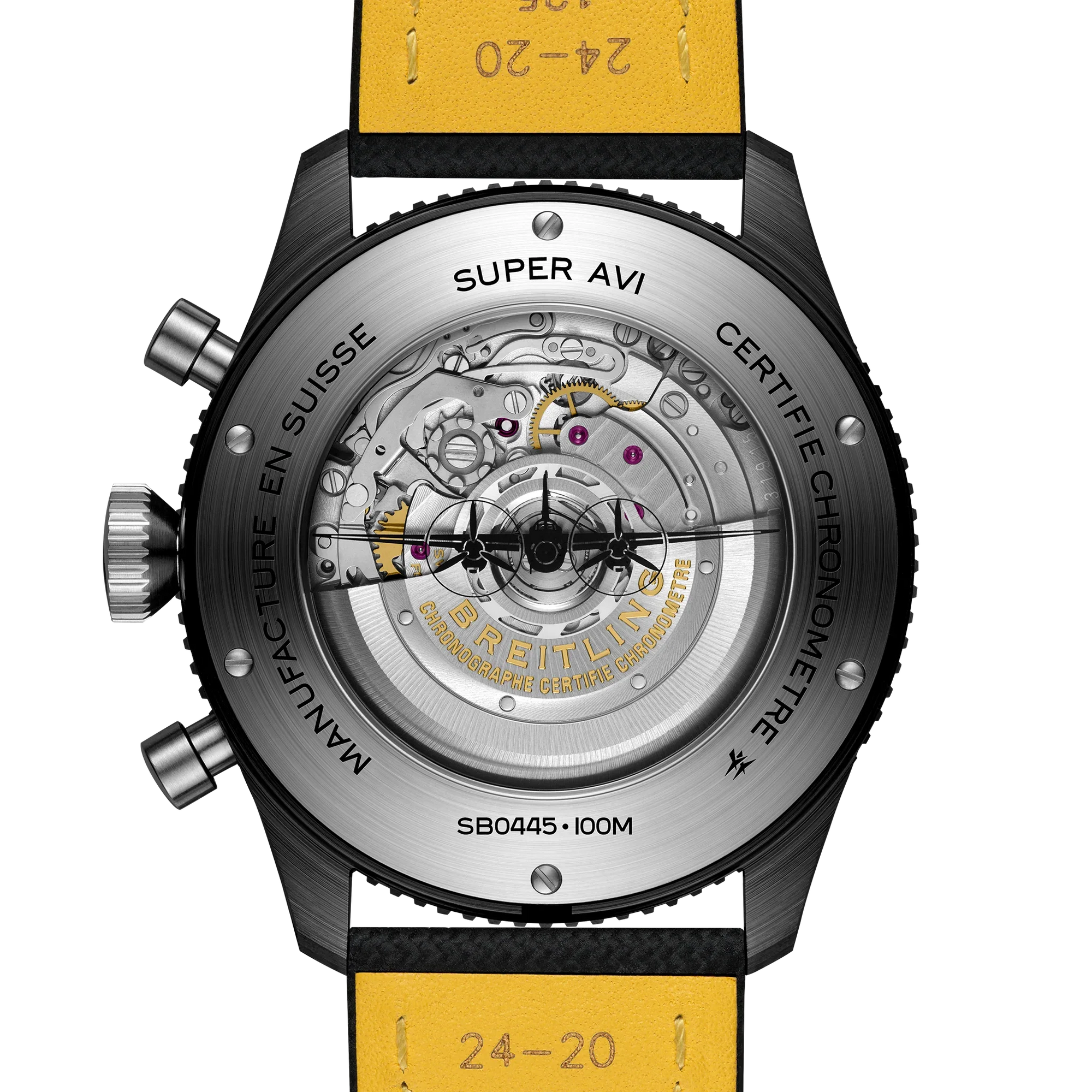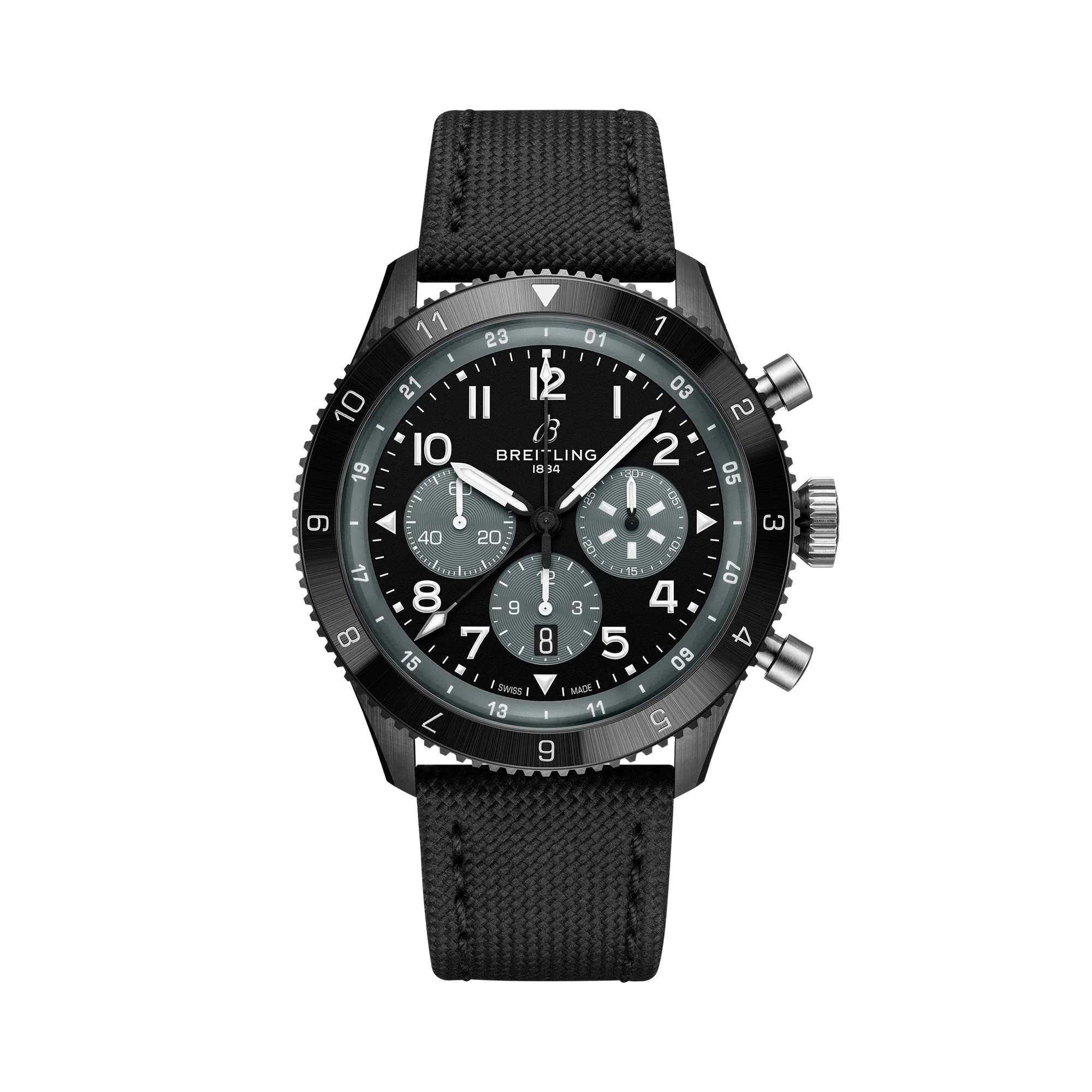 From brave first takeoffs to the birth of commercial air travel, Breitling’s history is inseparable from that of flight. In the 1930s, Breitling’s Huit Aviation department made its name inventing precision cockpit clocks. Two decades later, it introduced yet another novel flight instrument, this time in wearable form: the Ref. 765 AVI. That pioneering pilot’s watch provided the technical backdrop for today’s Super AVI, a collection inspired by the rugged spirit of famed early aircraft. The Super AVI Mosquito honors one of those legends. In an era when aluminum and steel shortages were common, the engineers behind the de Havilland Mosquito made use of a still plentiful material: wood. The “Wooden Wonder” caused shockwaves when it outperformed its metal contemporaries to become one of the fastest planes built between 1940 and 1950. Its superior maneuverability allowed it to multitask in roles as far ranging as light bomber, transport, and photographic reconnaissance aircraft. This Super AVI Mosquito gets its inspiration from the Night Fighter 2, an all-black two-seater aircraft meant to slip stealthily through the night sky. As a true pilot’s watch designed to withstand the rigors of a vintage cockpit, the Super AVI Mosquito features large, highly legible Arabic numerals on the dial and bezel. The overall black ceramic case contrasts strikingly with the titanium pushers, crown, case back, and buckle. The knurled bezel provides optimal grip, even in a pilot’s gloved hands. The military-leather strap gives a nod to classic flight gear. Pilots and other travelers will appreciate the ability to track a second time zone using the 24-hour marking on the inner bezel and the white-tipped GMT hand. The engine of the Super AVI is the COSC-certified Breitling Manufacture Caliber B04 movement, which provides approximately 70-hours of power reserve.