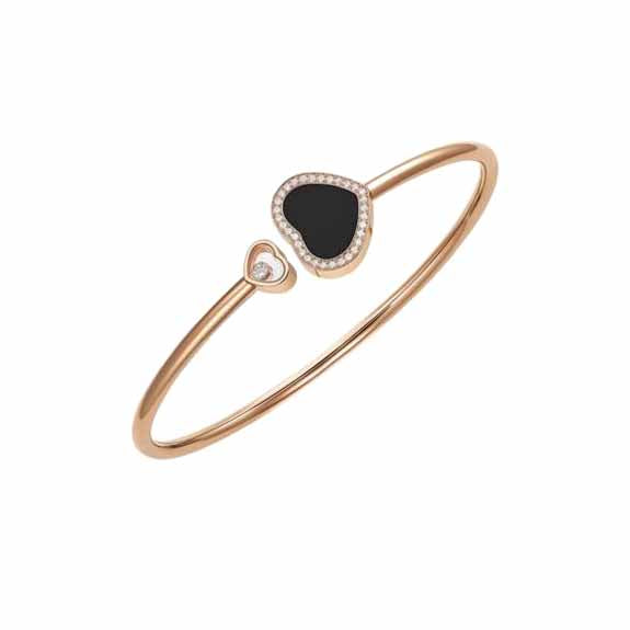 18K Rose Gold Chopard Happy Hearts Onyx Inlay Medium Size Bangle With A 32 Diamond Halo .14CTW And 1 Moving Diamond .05CT