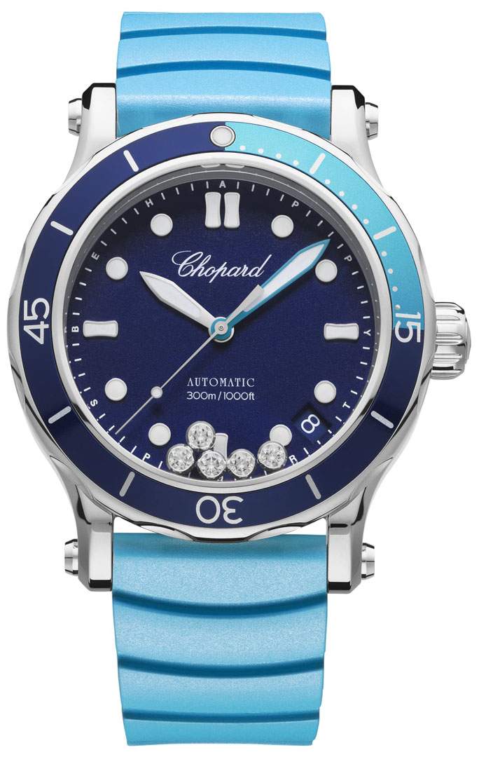 Stainless steel Chopard Happy Ocean 278587-3001 with 5 diamonds and an ocean blue dial on a blue rubber strap