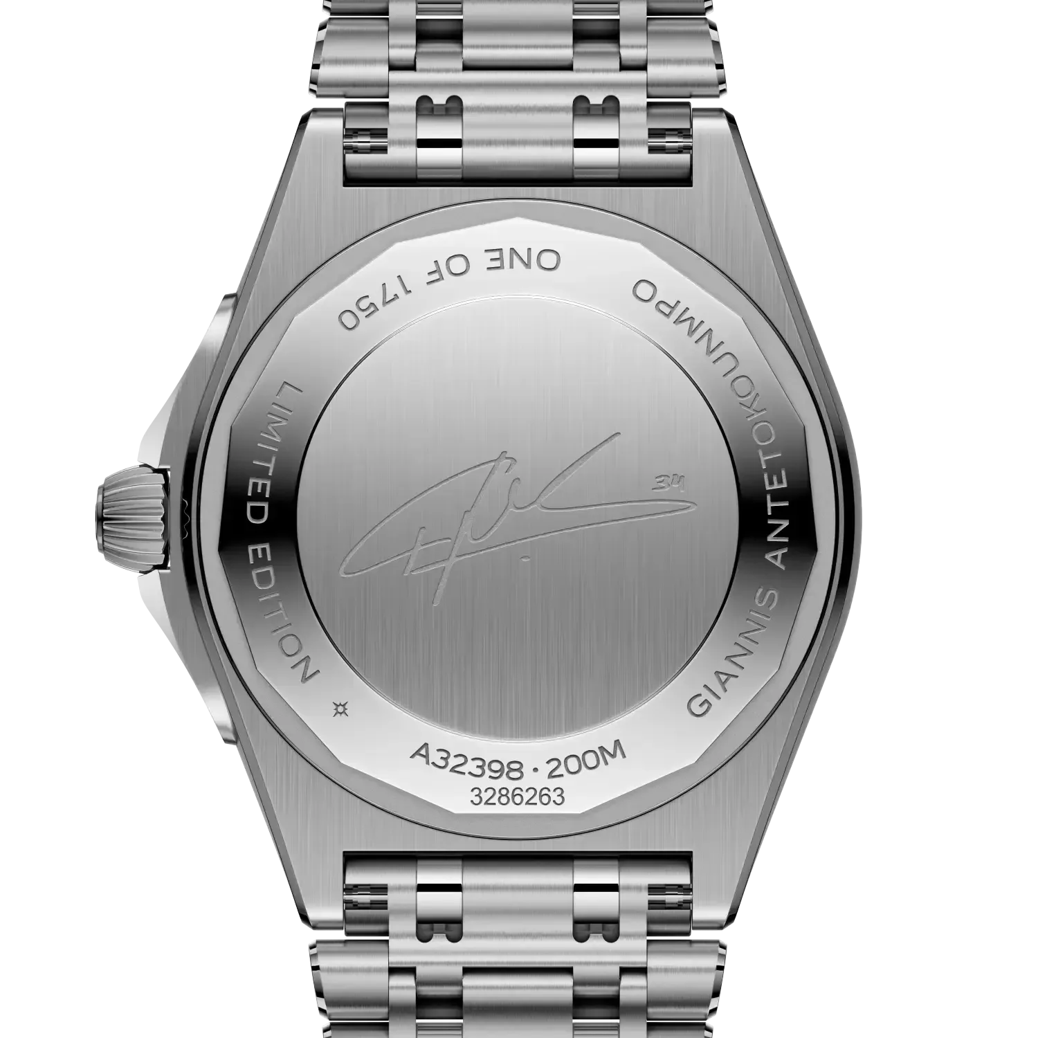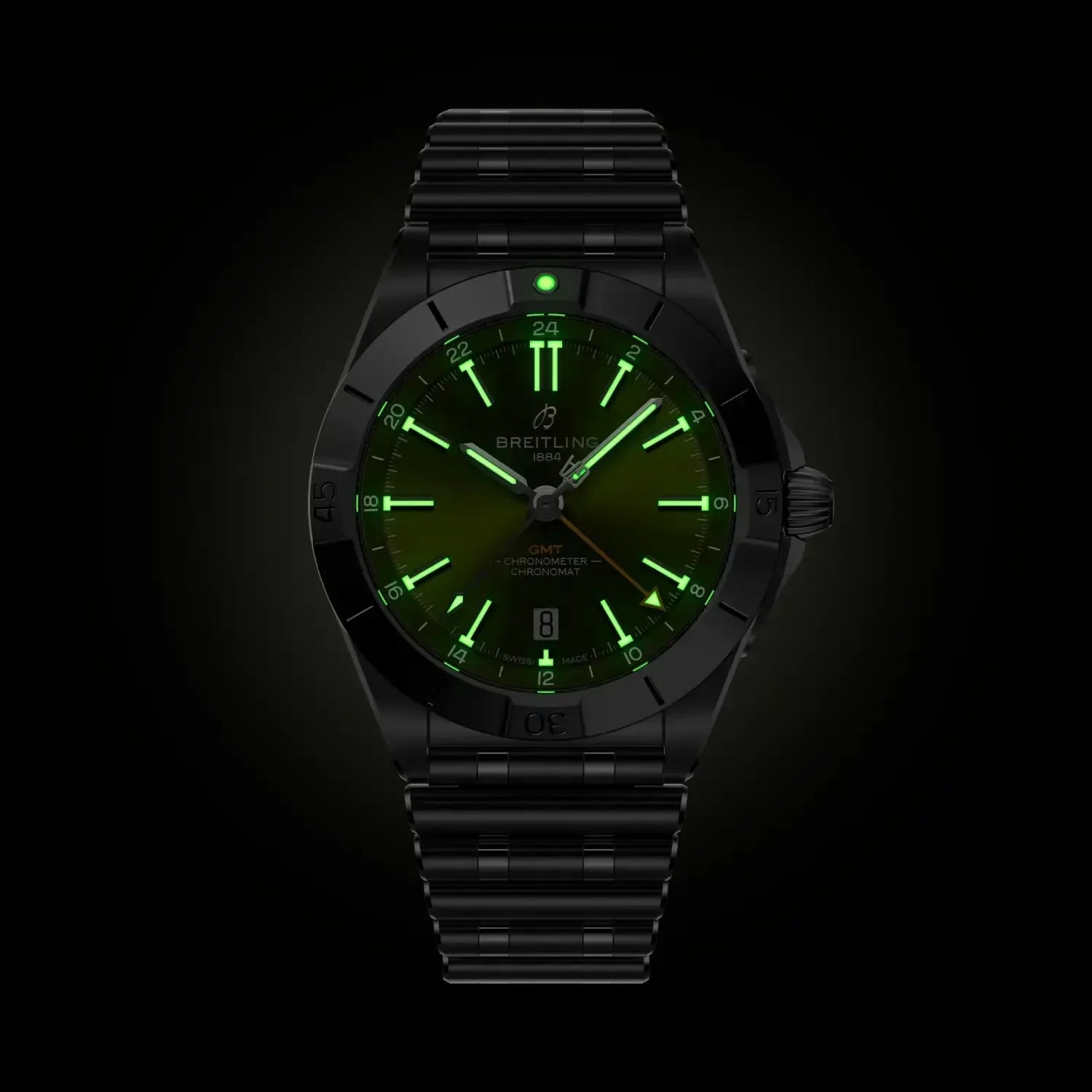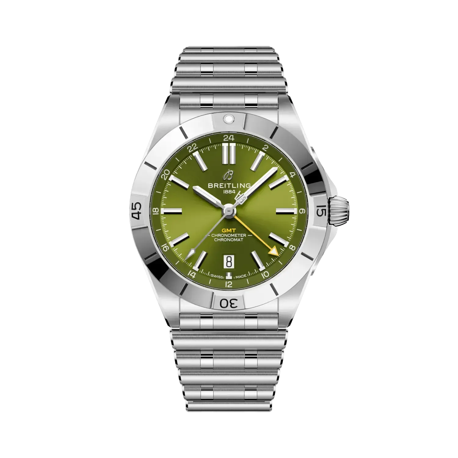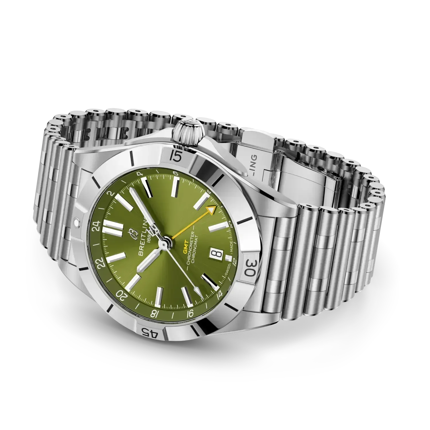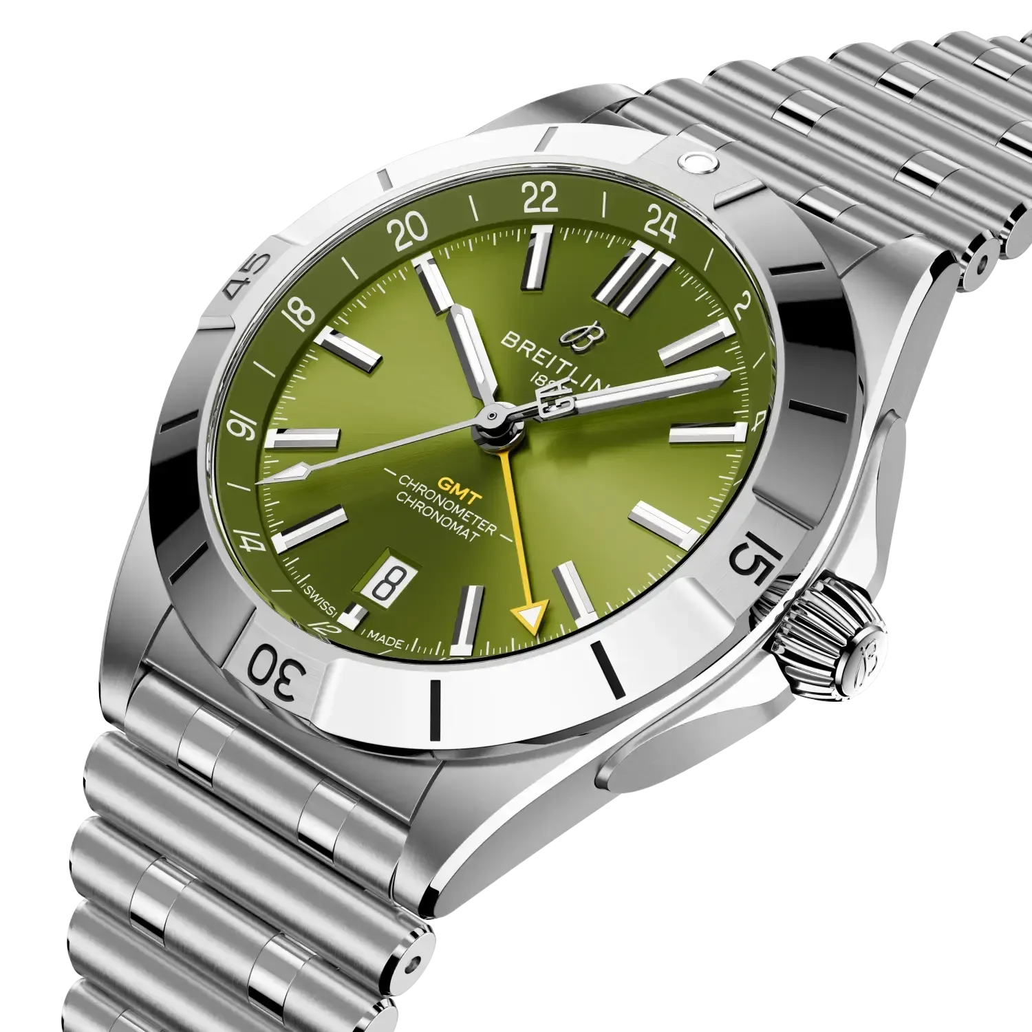 Breitling’s versatile Chronomat in a limited-edition collaboration with Giannis Antetokounmpo. Limited to only 2,000 pieces, the Giannis Antetokounmpo Chronomat collection combines our timeless craftsmanship with the Pro Basketball Player’s easygoing style. It features green colorways chosen by Giannis himself while preserving classic Chronomat design elements such as the “Rouleaux” bracelet—in metal or rubber—and raised rider tabs at the 15-minute marks. Note the central hand’s counterweight bearing the athlete’s initials “GA” and the basketball outline on the running seconds counter of the Chronograph—a nod to his profession and passion. The limitation, “One of 1750” for the 40 mm stainless-steel Automatic GMT or “One of 250” for the 42 mm 18 k red gold Chronograph is engraved on the case back. Each watch comes in a special box with a note from Giannis. A watch enthusiast, Giannis has also designed his own one-of-a-kind Chronomat featuring a green inverted-panda dial and Eastern Arabic numerals—though you might only catch a glimpse of this unique piece courtside. The Chronomat Giannis Antetokounmpo collection is meant for those who can relate to the basketball MVP’s power, precision, and performance—traits that have everything in common our timepieces.