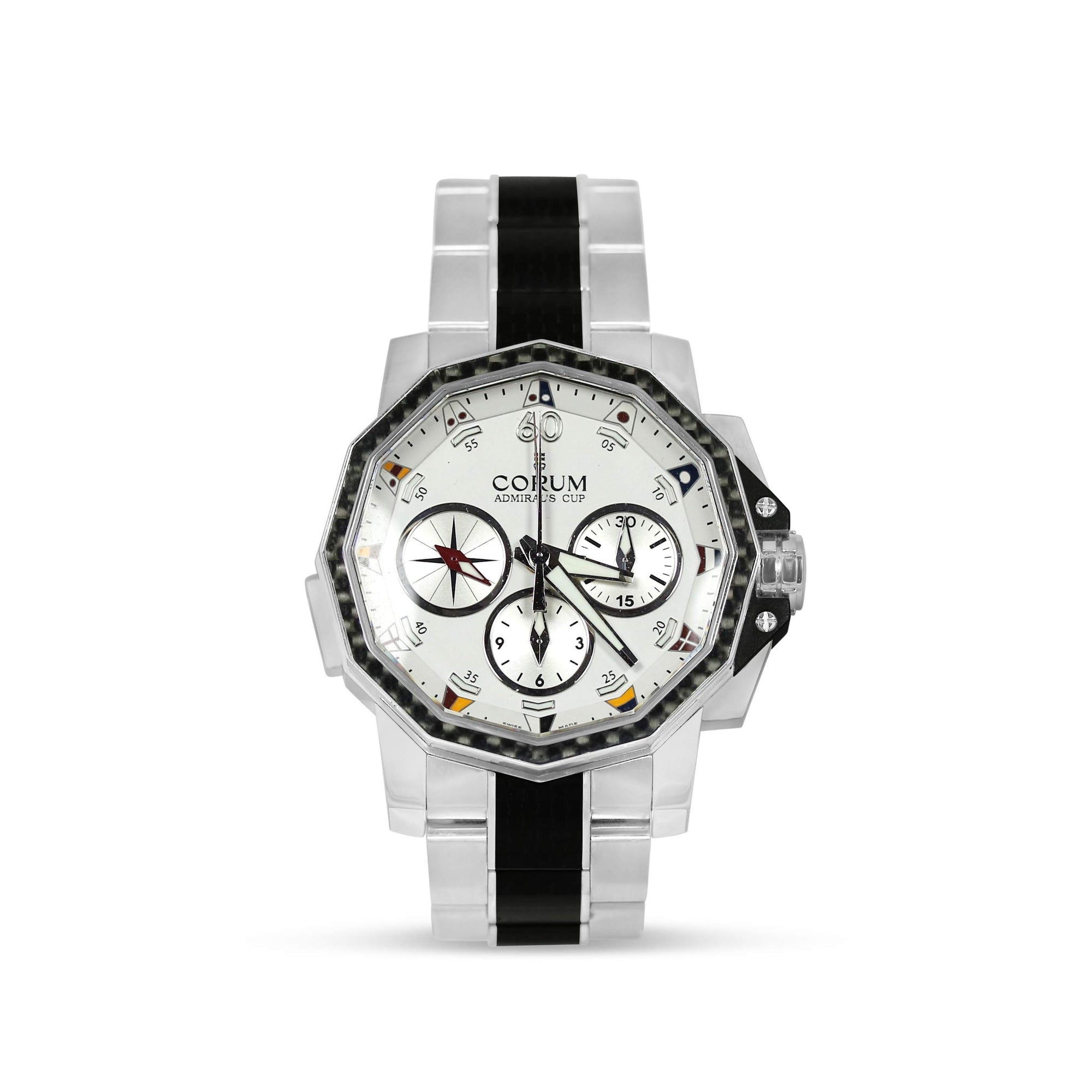 Pre owned fully refurbished Corum Admirals cup chronograph, stainless steel watch, includes original box and papers.