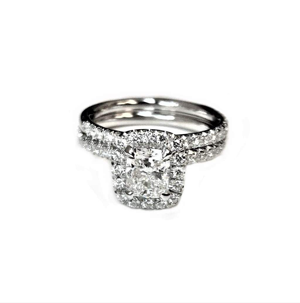Set features a GIA certified 1.01 carat cushion cut center diamond, E color, VVS2 clarity and .65 carats total diamond weight, including the matching wedding band, set in 18K white gold.