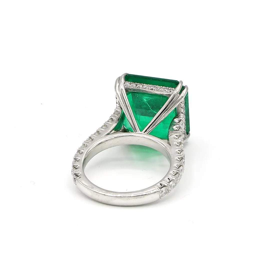 Ring features a 12.93CT AGL certified Colombian emerald and diamond ring with 1.21 carats total weight of diamonds in a custom setting of platinum.