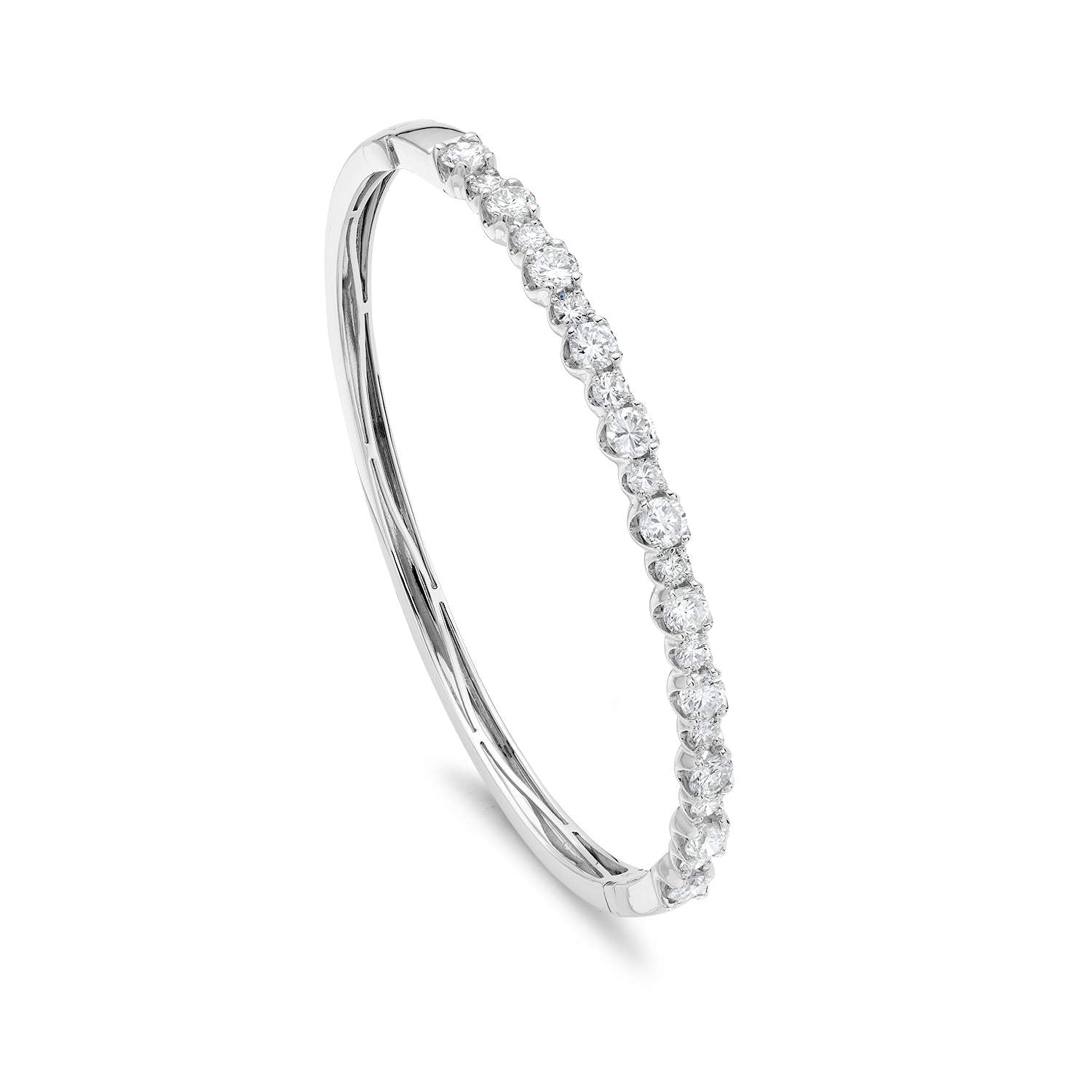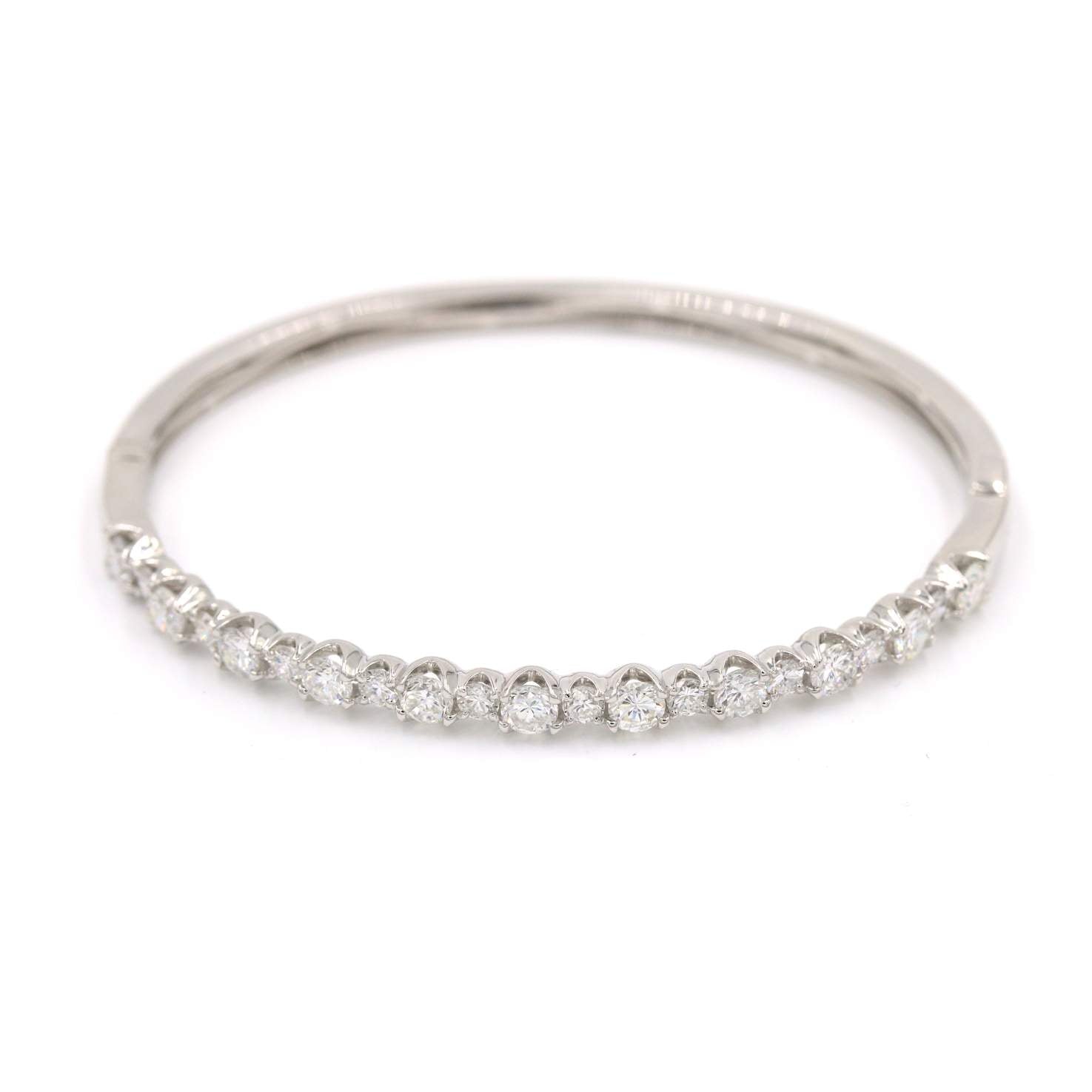 18 karat white gold bangle containing 3.00 carats of round diamonds going halfway.