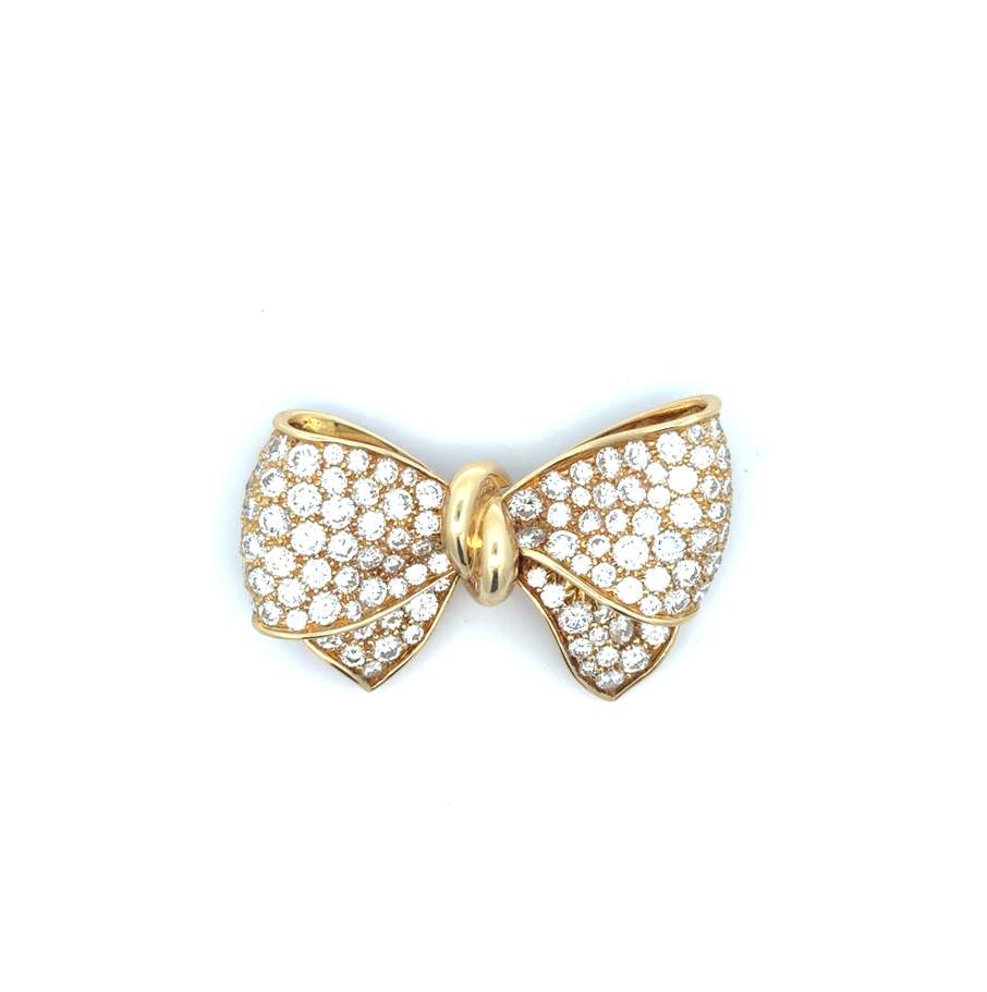 Diamond bow pin crafted in 18 karat yellow gold and features approximately 3.75 carats of white round diamonds.