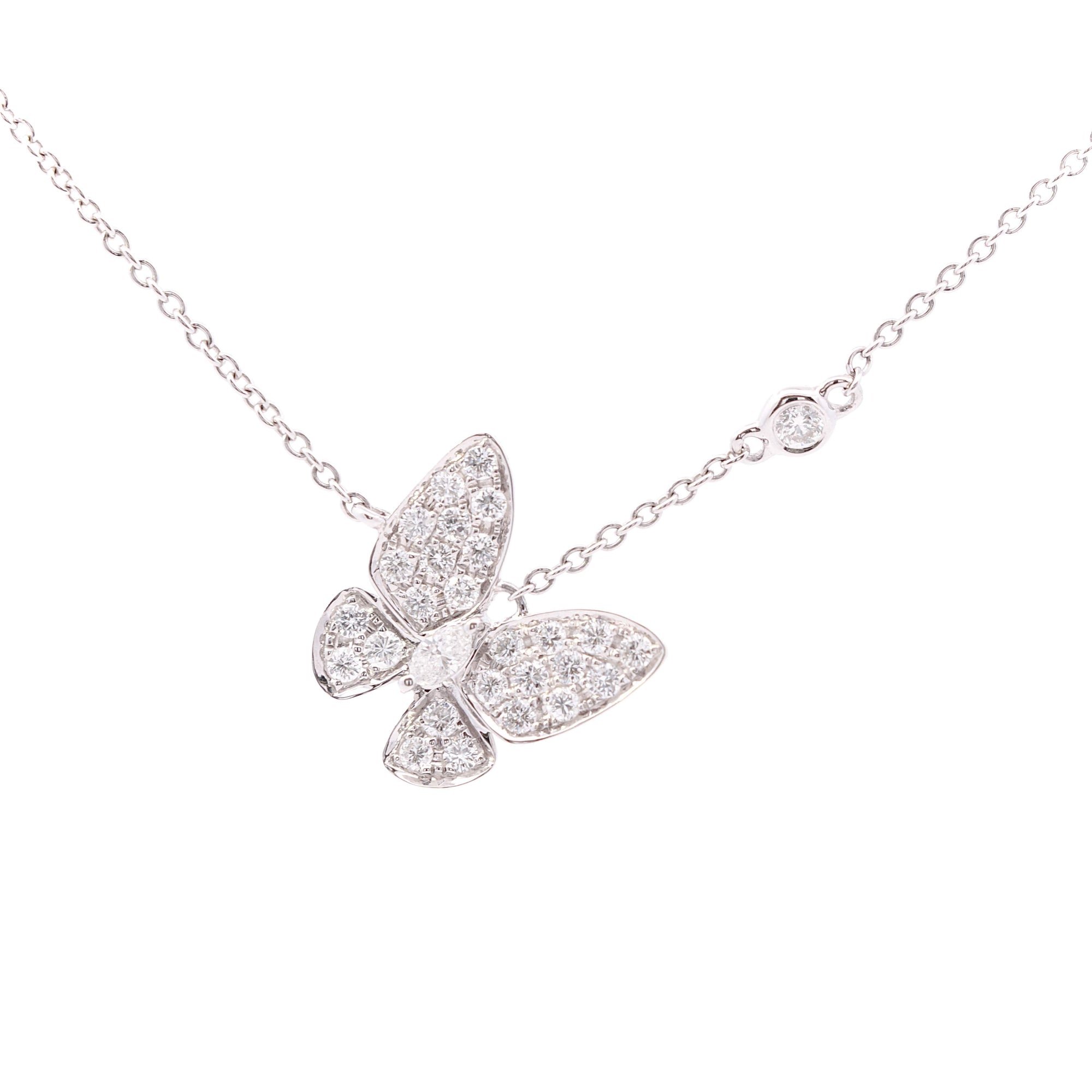18 karat white gold butterfly necklace containing 0.55 carats of round diamonds with 0.07 carats of a marquise diamond.