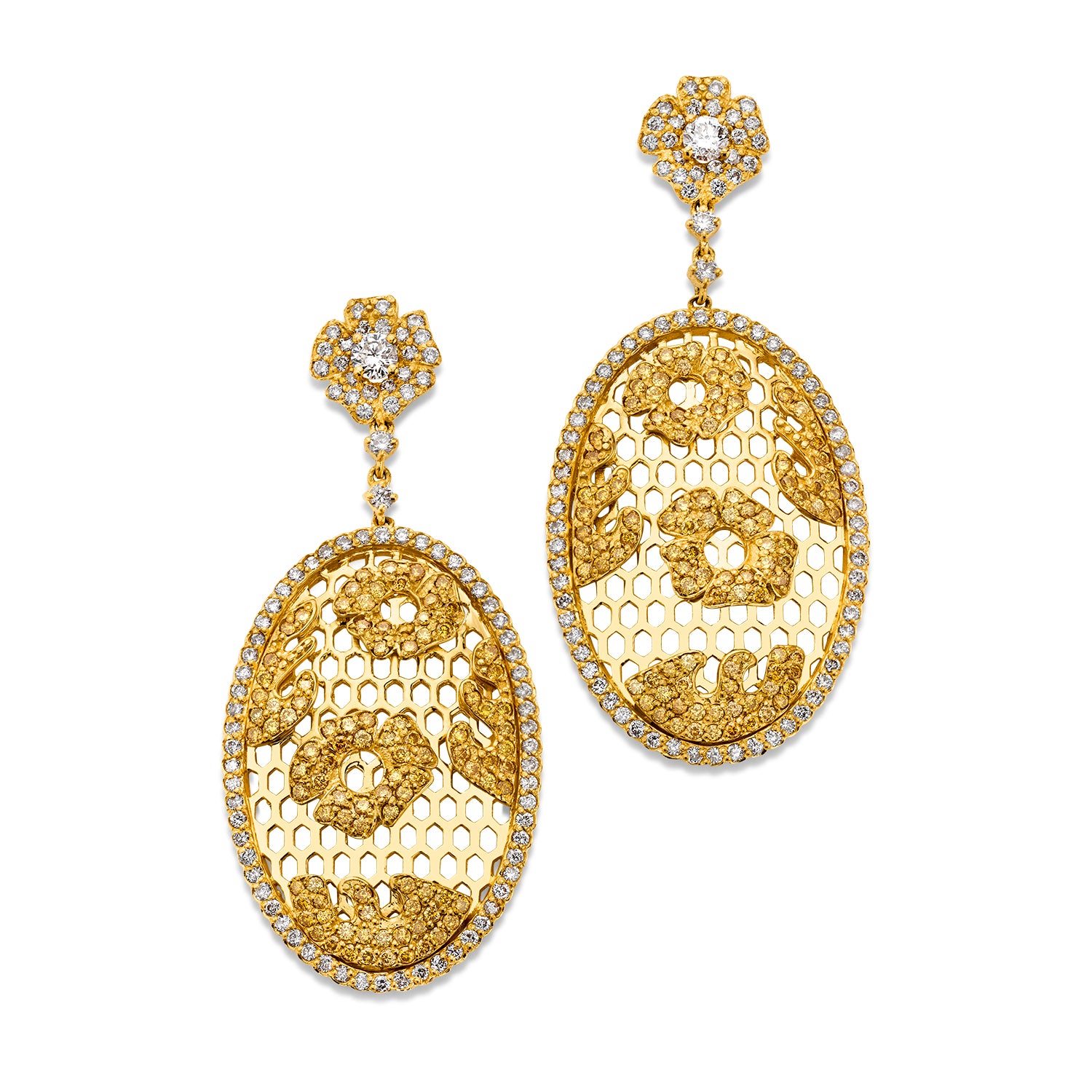 18 karat yellow gold cocktail earrings containing 1.95 carats of natural yellow diamonds surrounded by 1.95 carats of white diamonds with F in color and VS in clarity.