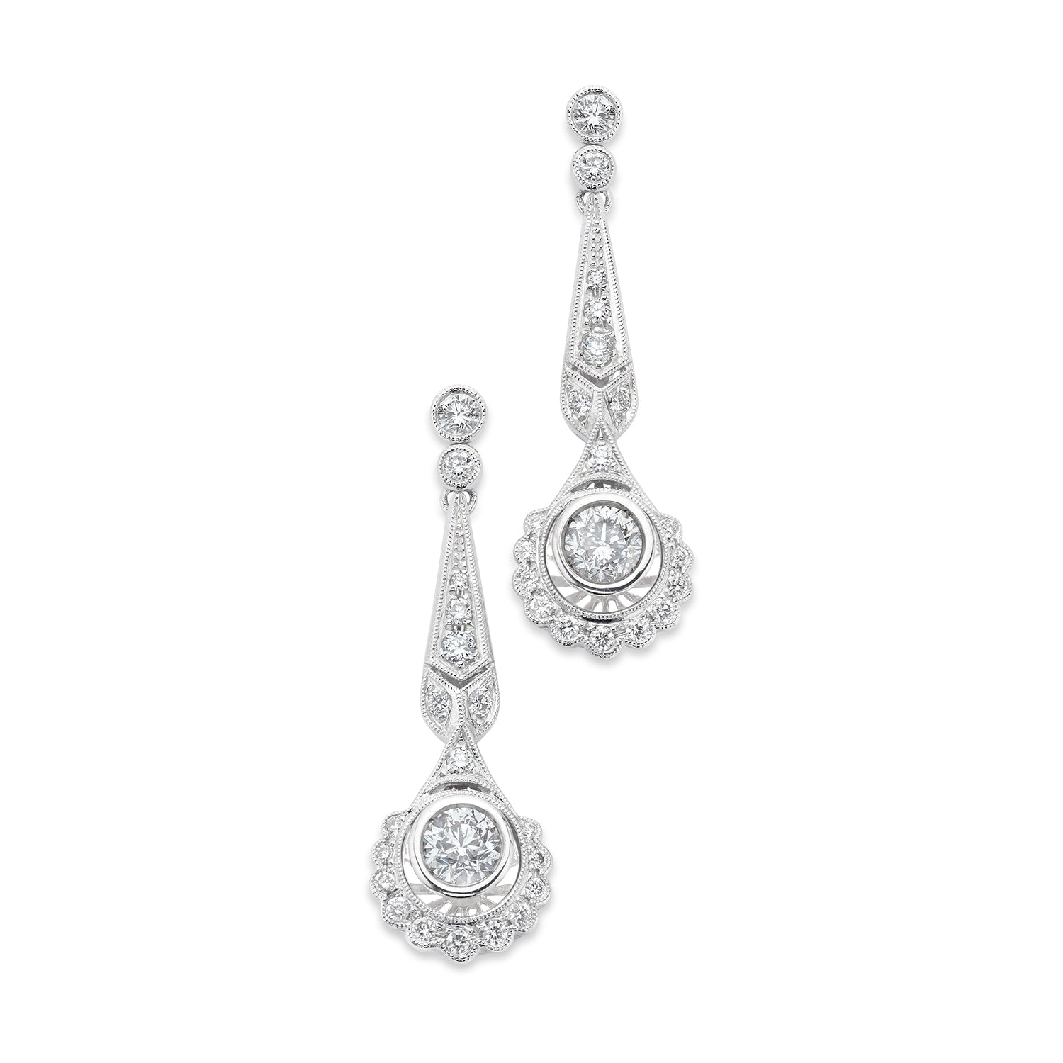 18 karat white gold Fashion Dangle Earrings containing 1.12 carat total of two round center diamonds surrounded by 1.94 carat total of diamonds.