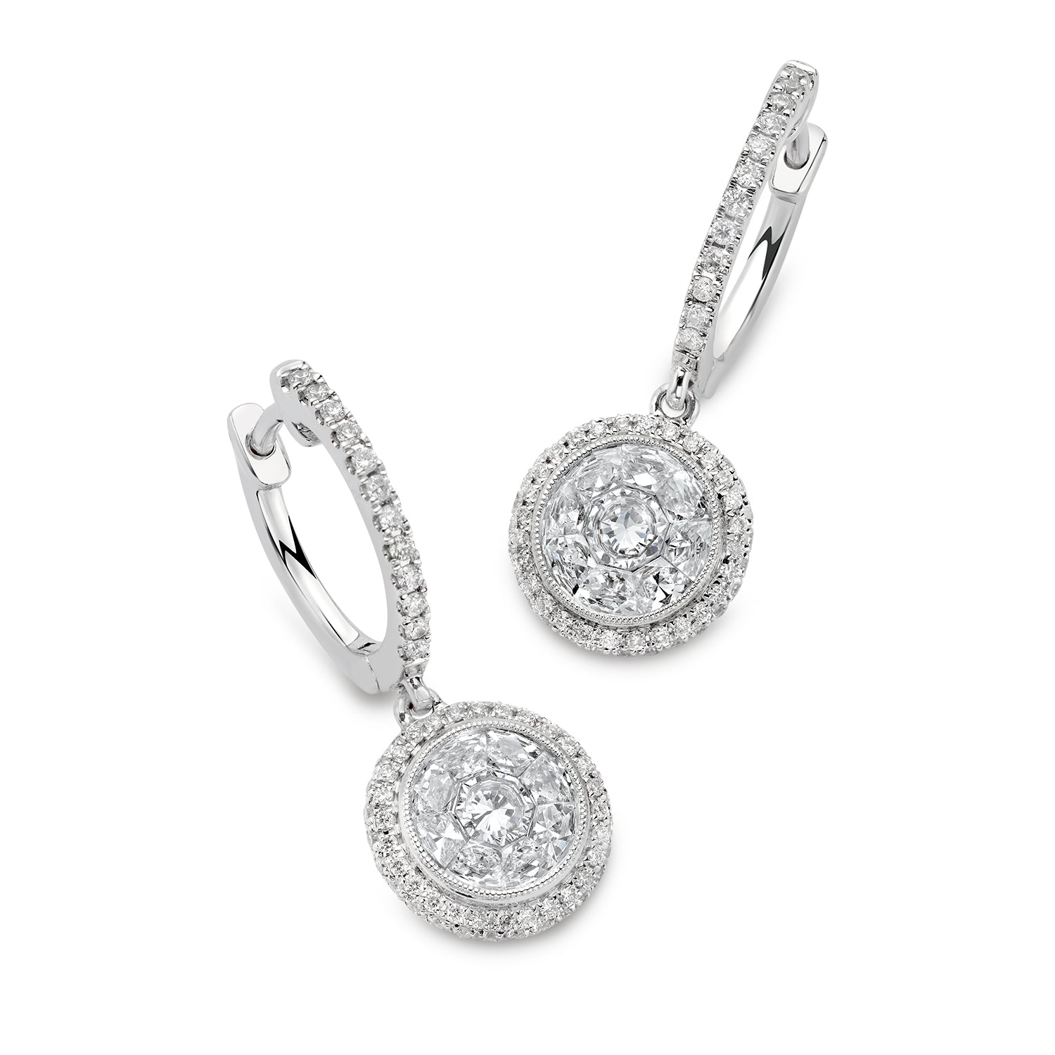 18 karat white gold round Earrings containing 1.39 carat total of diamonds.