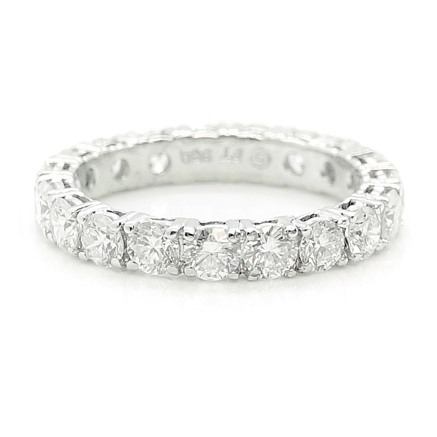 Platinum eternity band containing 2.25 carat total of round brilliant diamonds with H-I in color and VS-SI in clarity.
