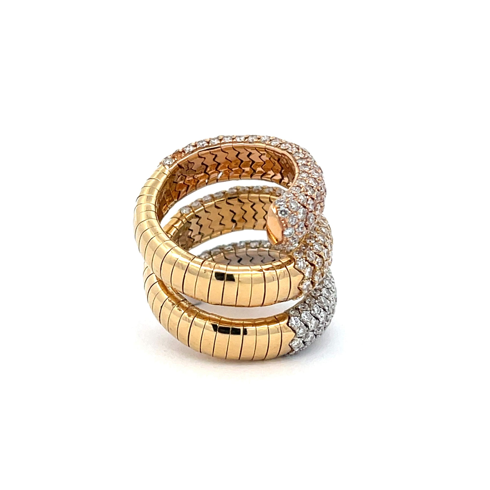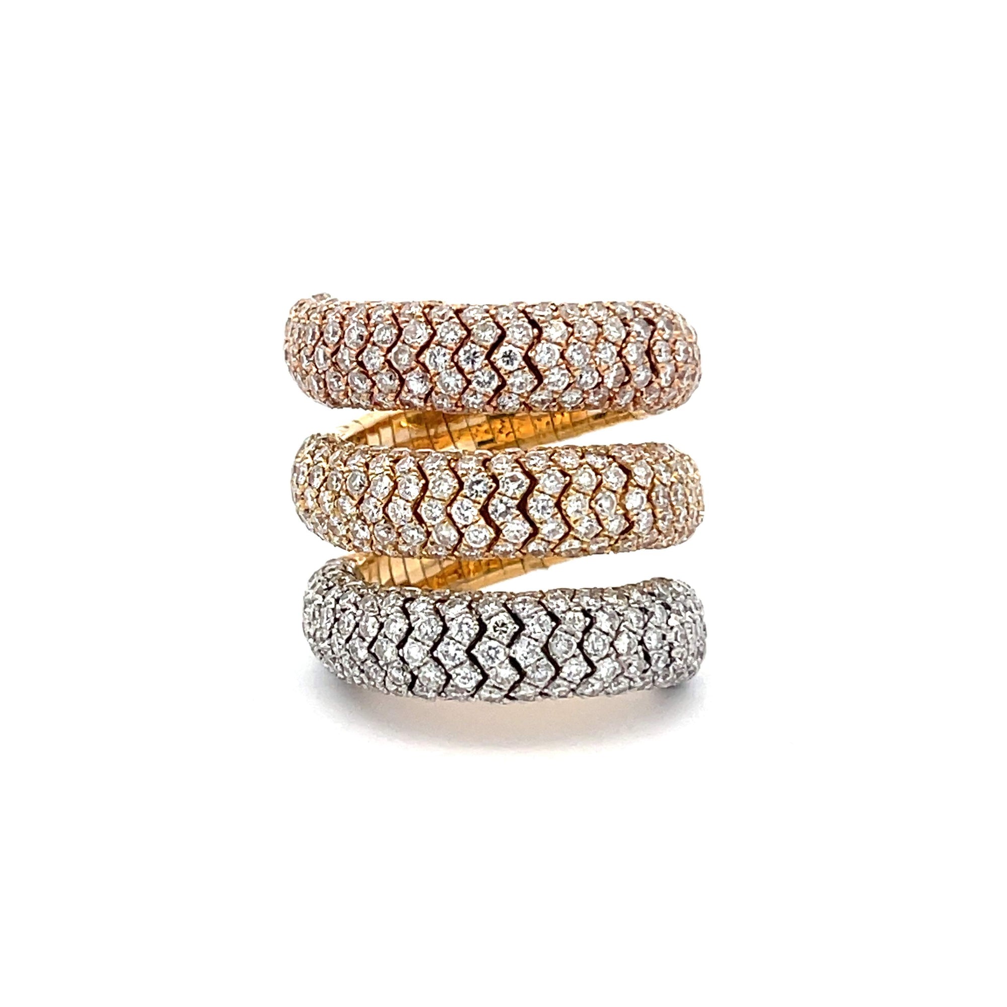 18 karat three tone gold fashion flex ring containing 4.66 carats of diamonds.