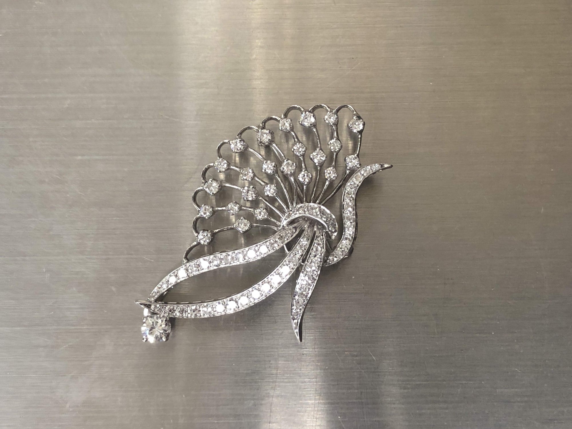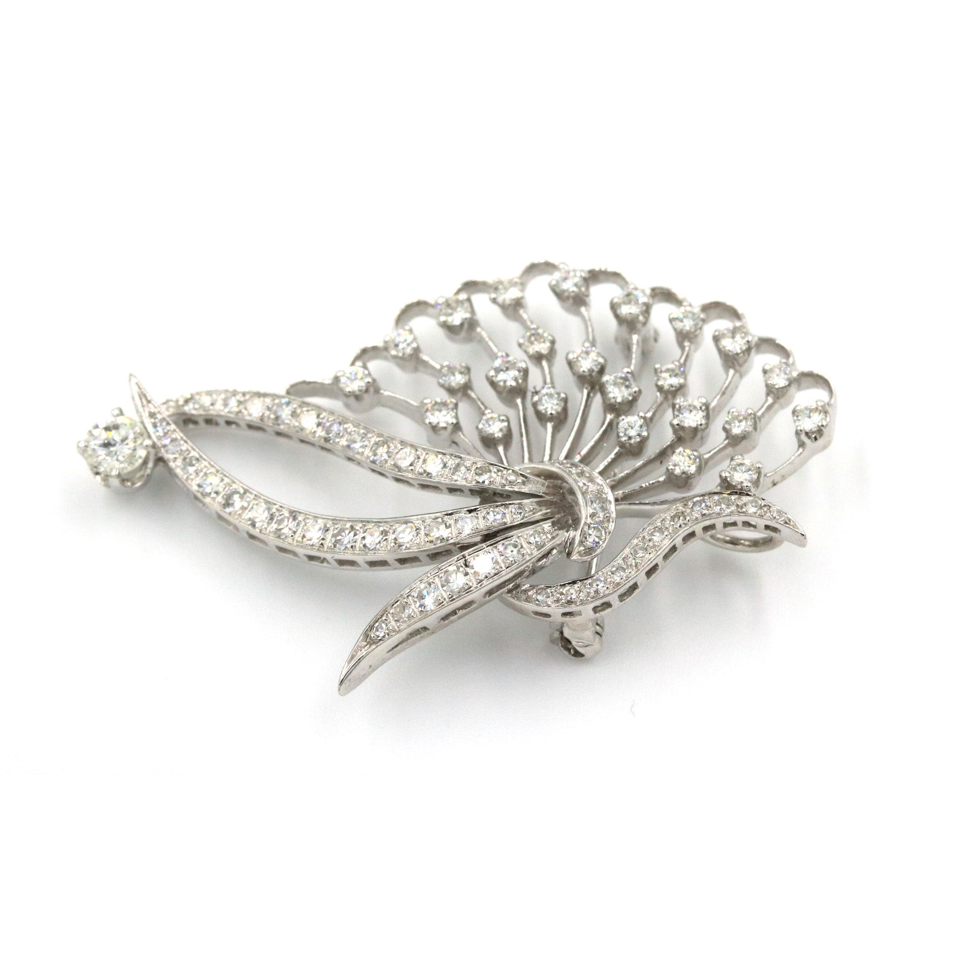 14 karat white gold fashion pin containing 1.60 carats of diamonds with G-H in color and VS-SI in clarity.