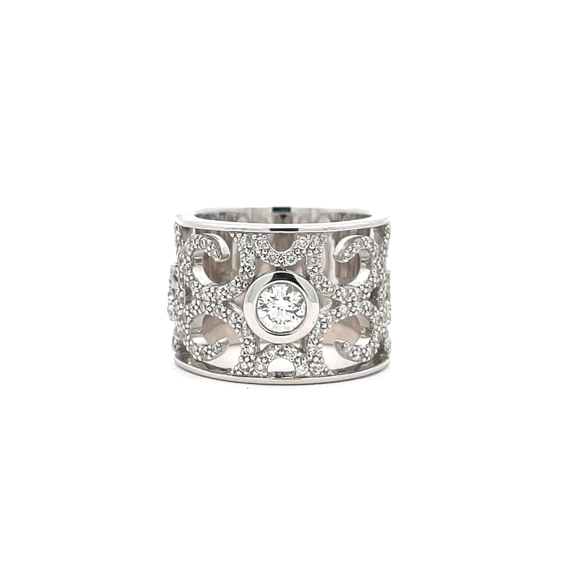 14 karat white gold wide band containing 0.80 carats of round brilliant diamonds and pave diamonds.