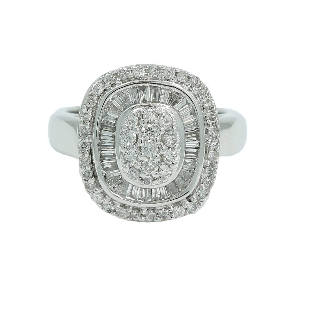 DIAMOND FASHION SQUARE TOP RING IN 14K WHITE GOLD WITH ~1.25 CARAT TOTAL WEIGHT OF ROUND AND BAGUETTE DIAMONDS.