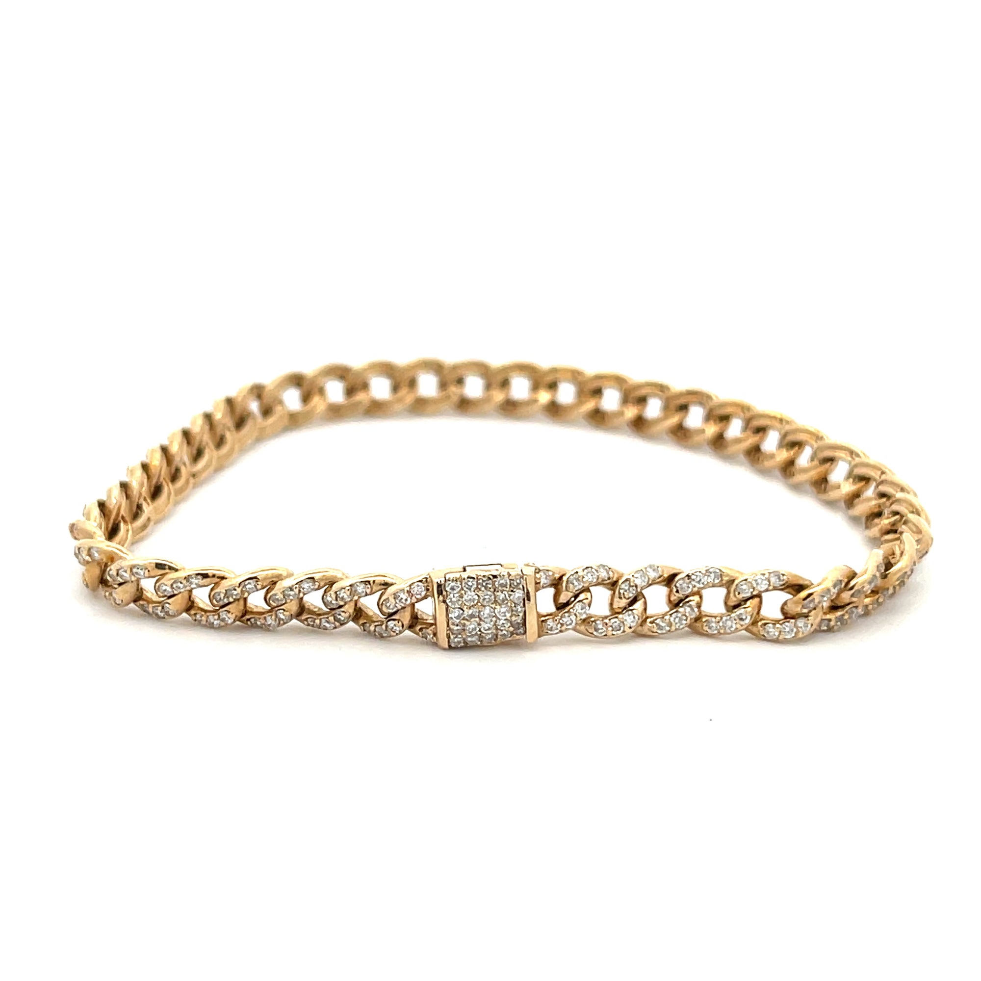 14 karat yellow gold link bracelet containing 1.67 carat total of round diamonds with F in color and SI in clarity.