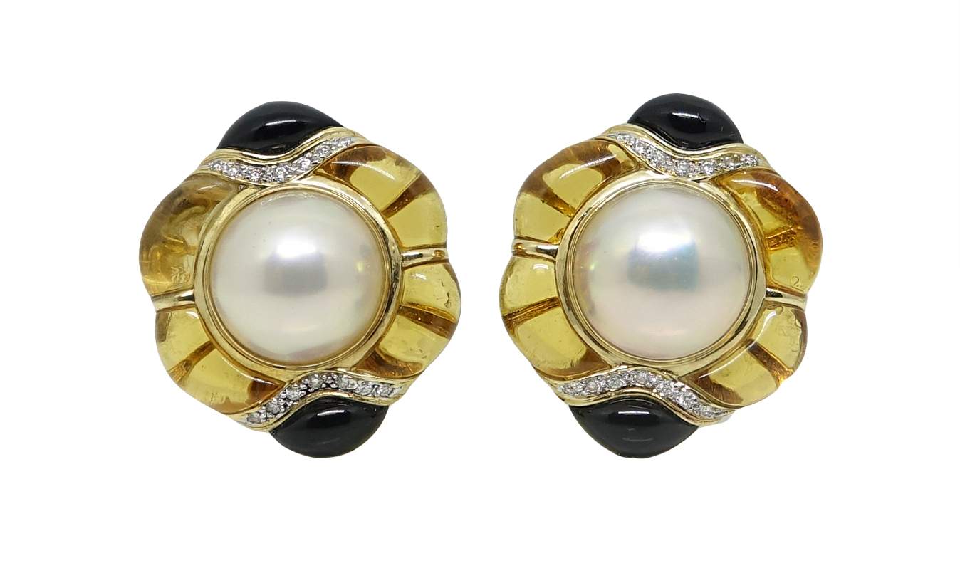 DIAMOND ONYX AND PEARL EARRINGS IN 18K YELLOW GOLD WITH MABE PEARLS, TOPAZ, ONYX AND DIAMONDS ~.25 CARAT TOTAL WEIGHT.